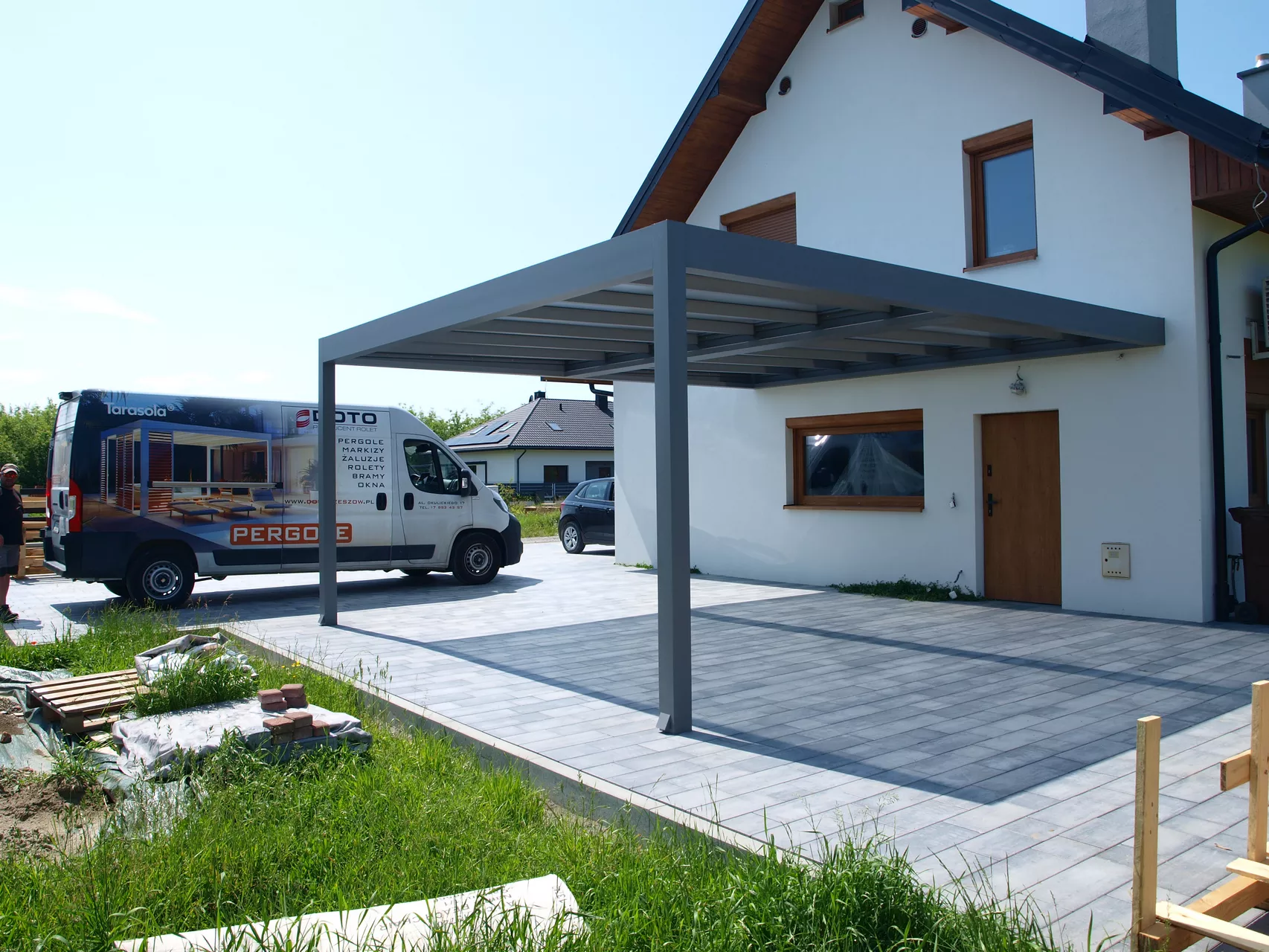 Tarasola Carport to nowoczesna wiata garażowa wykonana z aluminiowych profili (nogi i rama) oraz blachy trapezowej (dach).