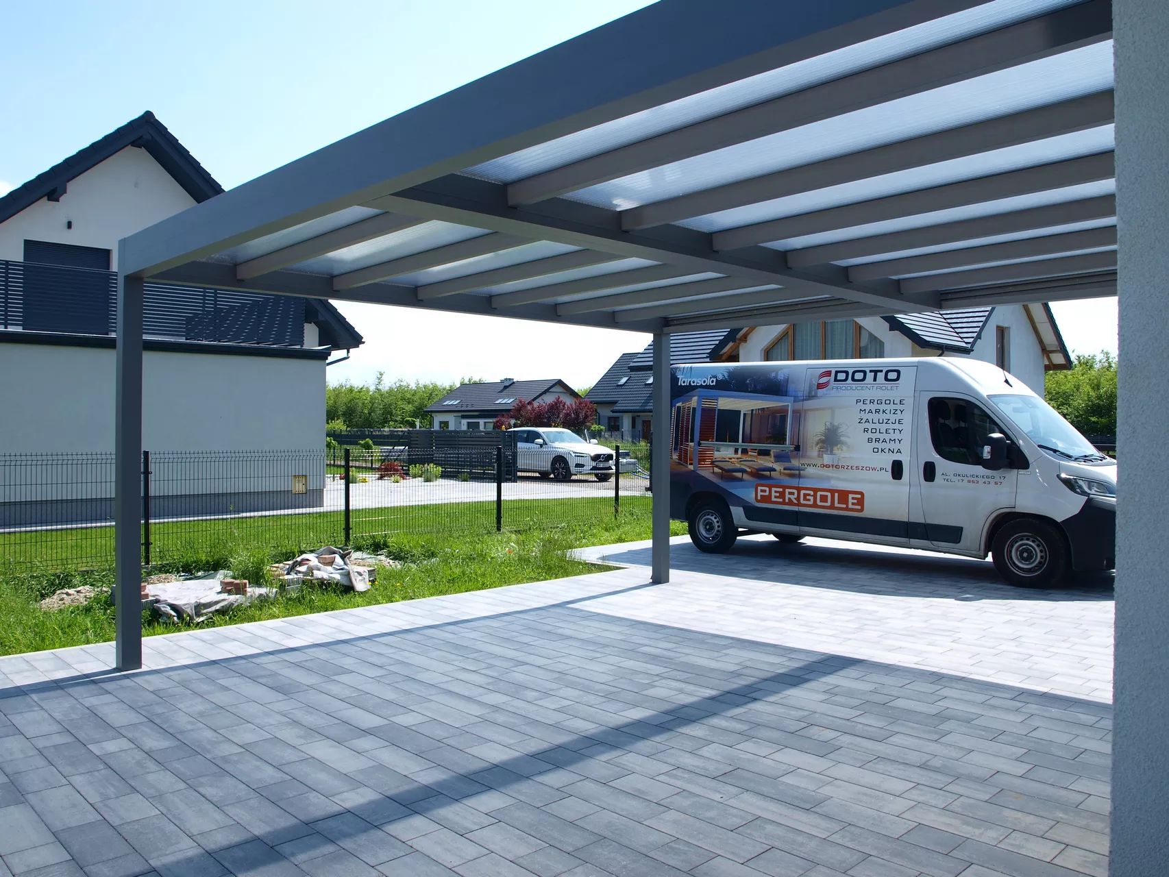 Konstrukcja posiada system odprowadzania wody, minimalistyczną formę i estetyczne wykończenie bez widocznych elementów mocowania, co pozwala dopasować Carport do każdego otoczenia.