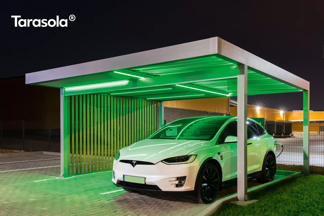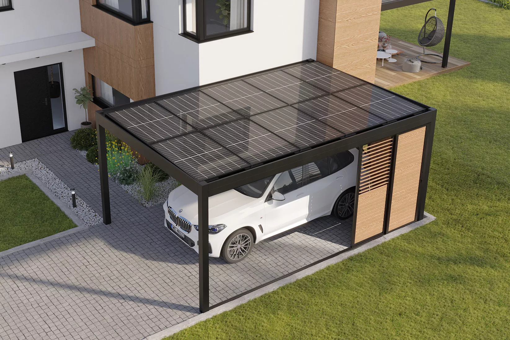 Największą innowacją Tarasola Carport jest możliwość montażu paneli fotowoltaicznych na dachu, dzięki czemu powstaje mała elektrownia słoneczna. Wyprodukowana energia może zasilać urządzenia domowe lub służyć do ładowania samochodów elektrycznych.