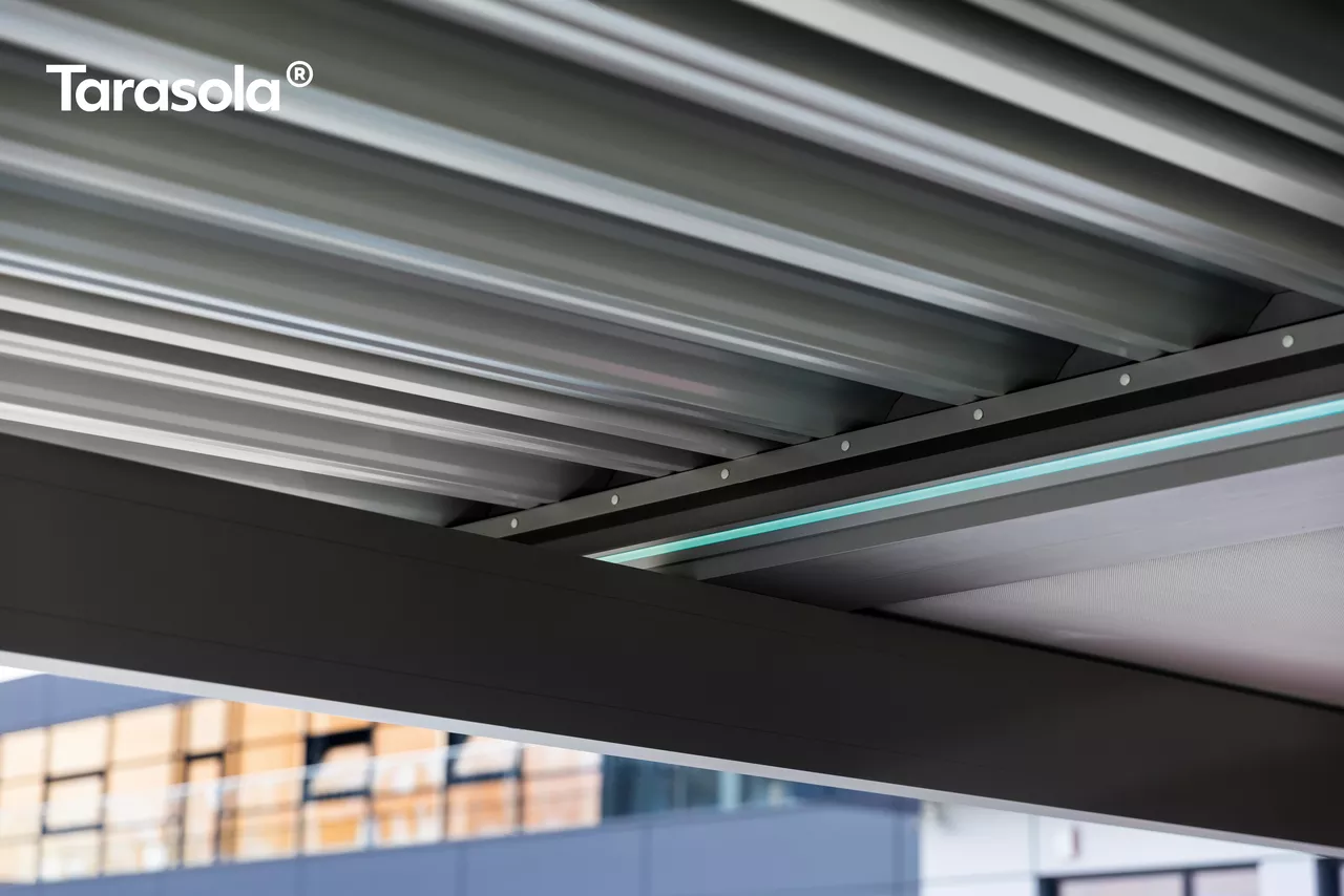 Opcjonalnie istnieje możliwość zamówienia dachu dolnego – tkaniny, która przykryje zadaszenie od dołu. Wówczas spód dachu jest wykonany z estetycznej tkaniny wyposażonej w belki umożliwiające montaż oświetlenia LED.