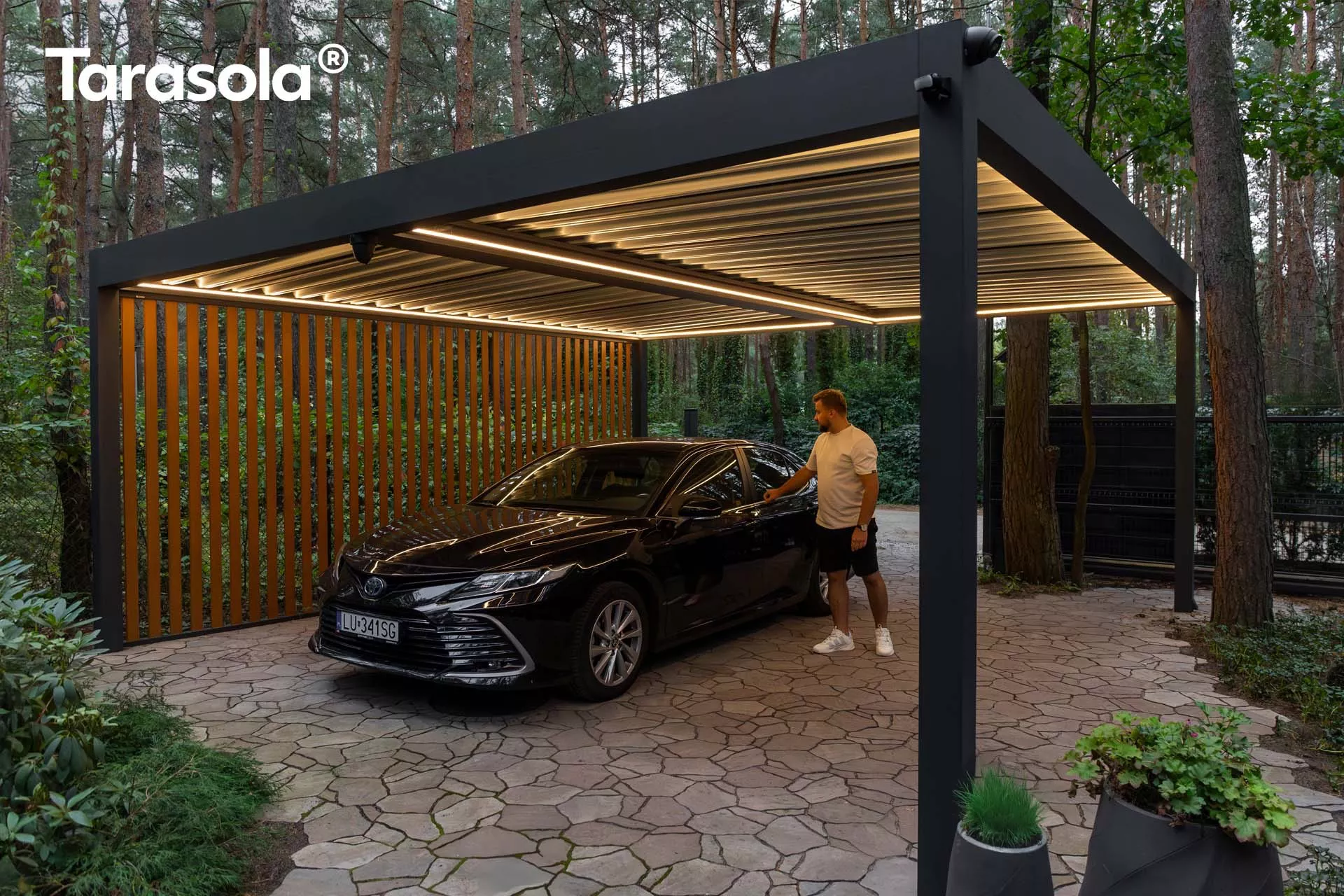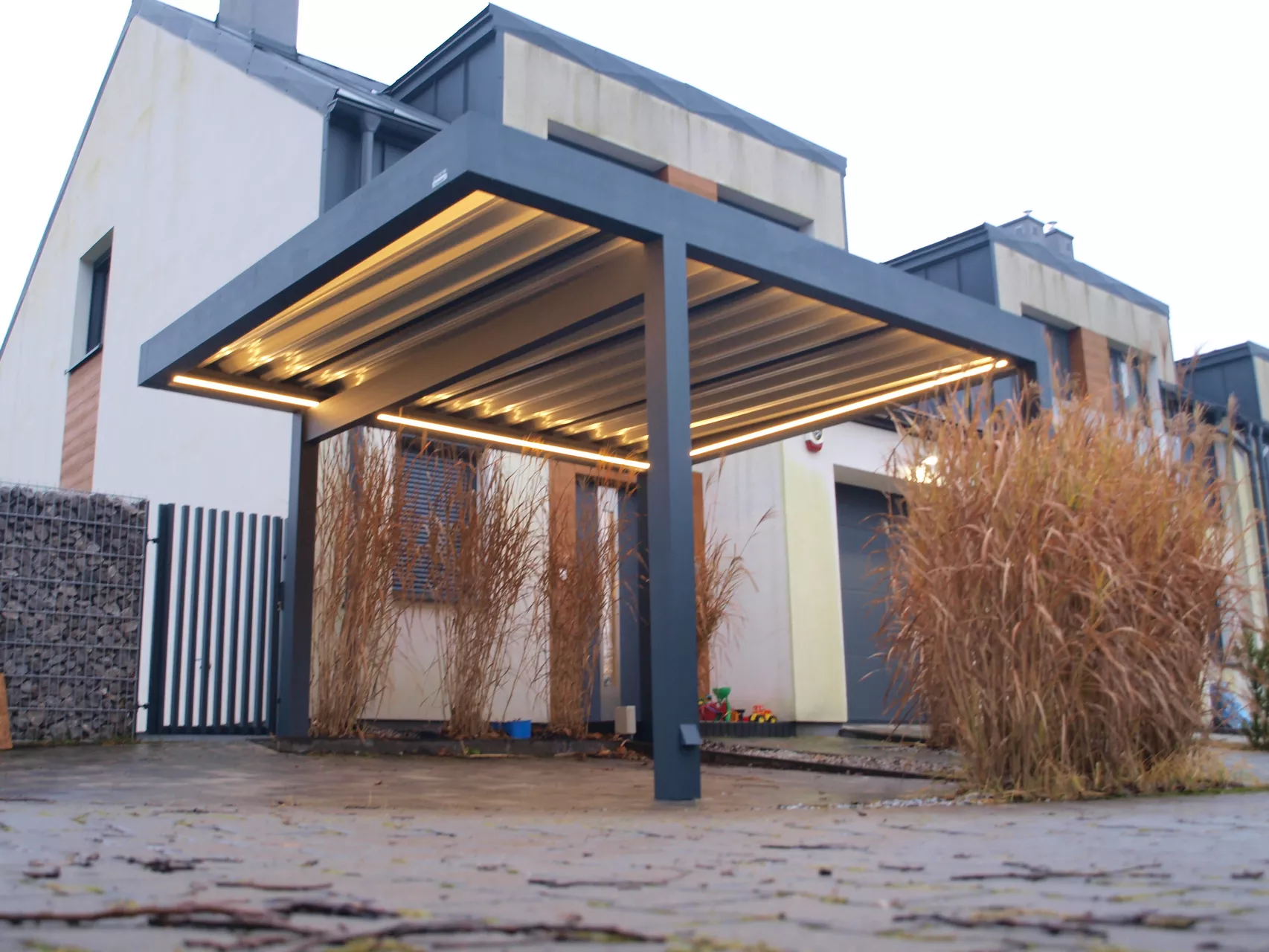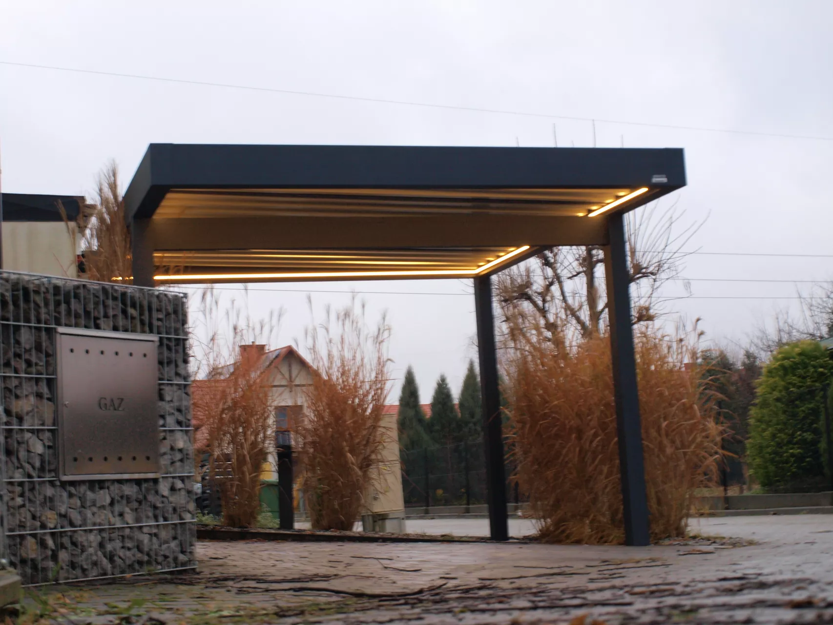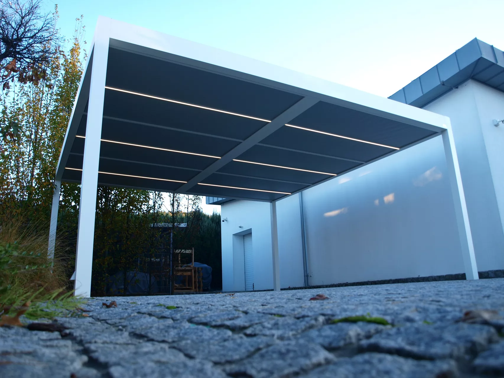 Opcjonalnie można zamówić dolny dach z estetycznej tkaniny z możliwością montażu oświetlenia LED, a także zabudowę boczną, jak rolety czy przeszklenia, które zwiększają funkcjonalność i ochronę.