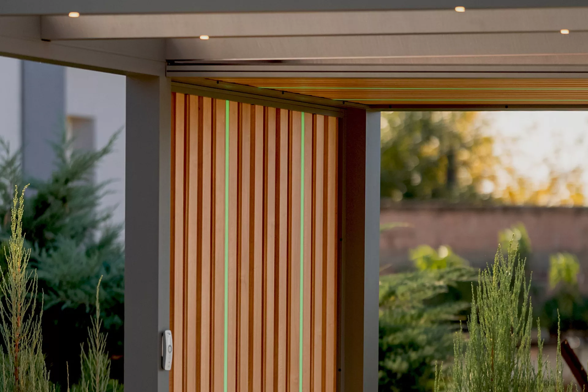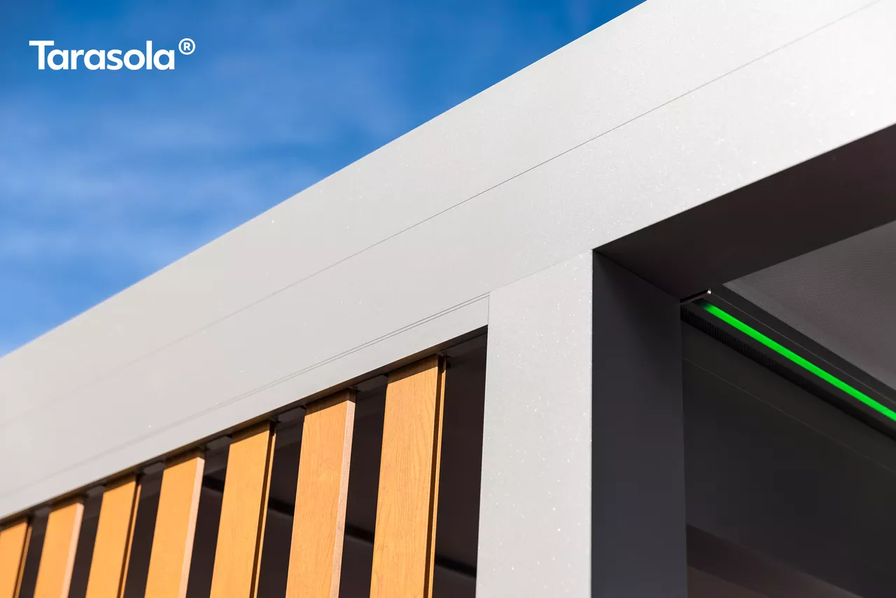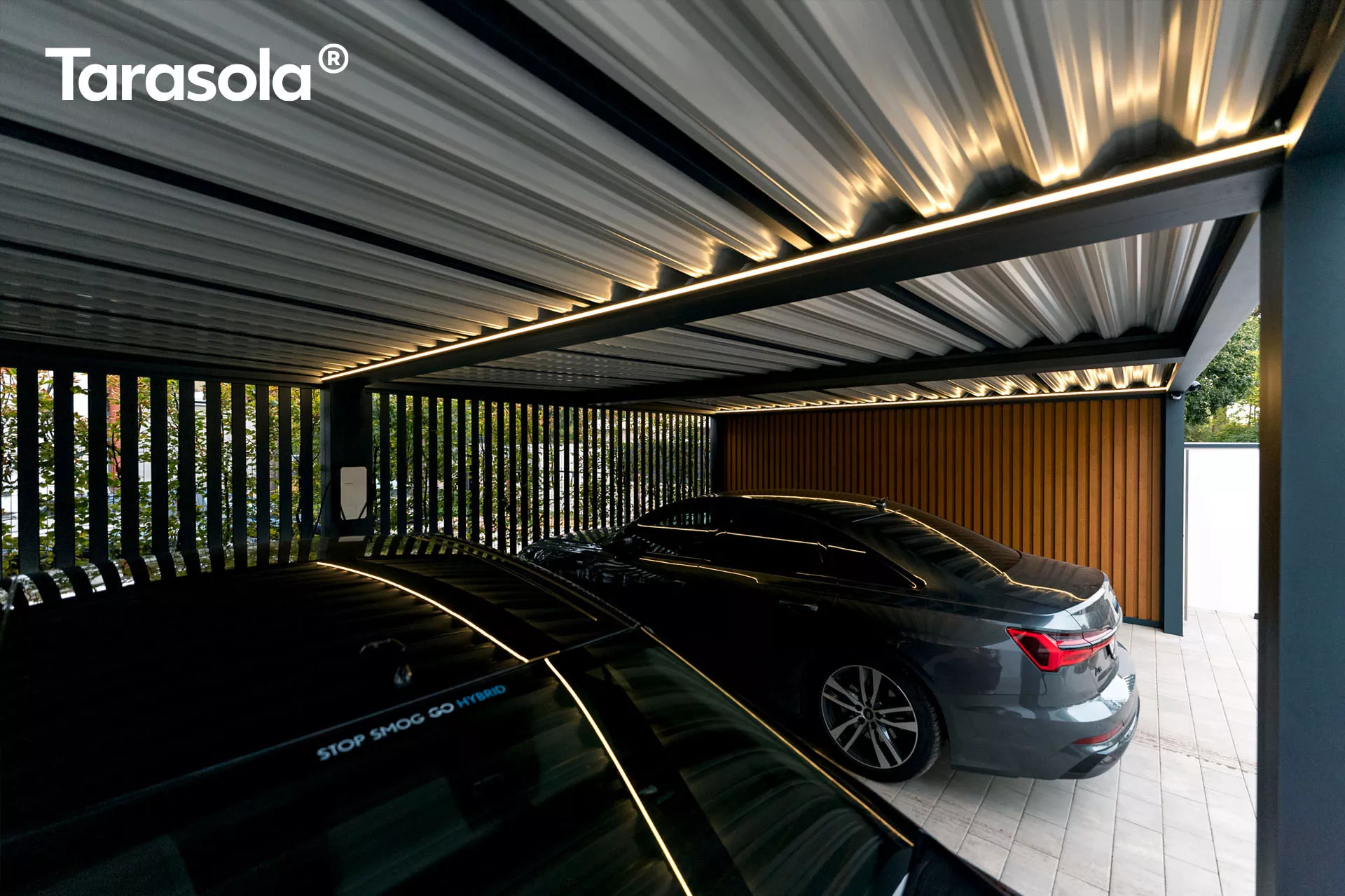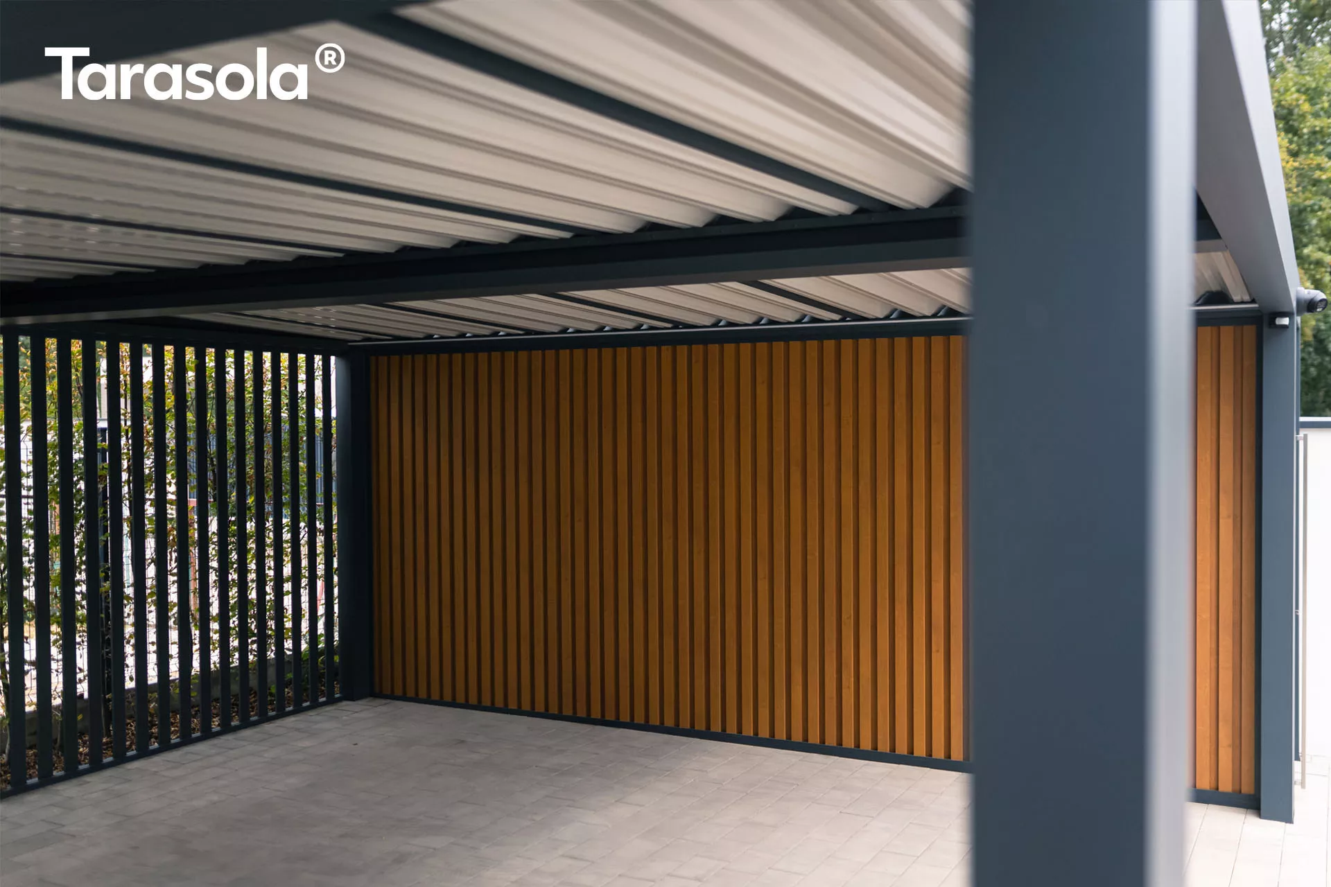 Opcjonalnie można zamówić dolny dach z estetycznej tkaniny z możliwością montażu oświetlenia LED, a także zabudowę boczną, jak rolety czy przeszklenia, które zwiększają funkcjonalność i ochronę.