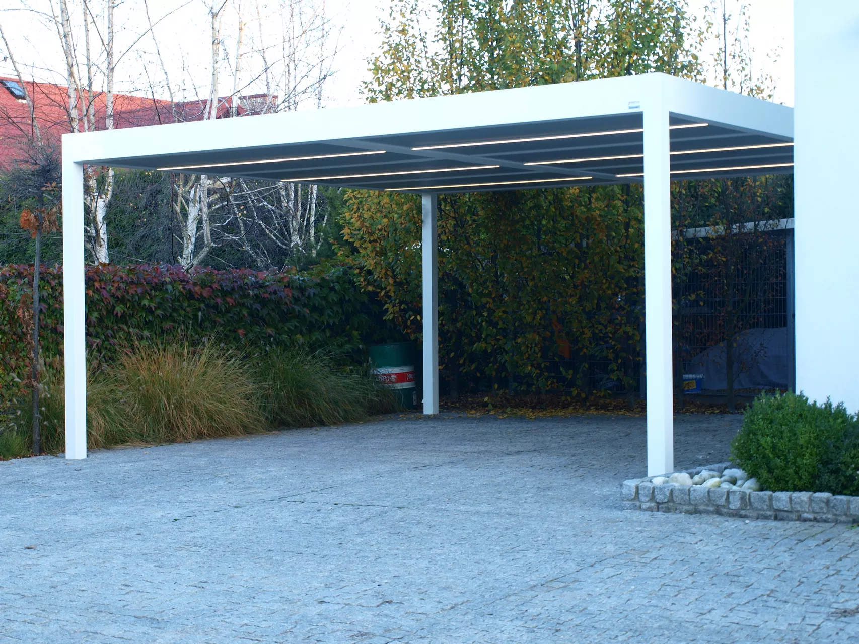 Jest to solidne, stałe zadaszenie z systemem odprowadzenia wody, które chroni auto przez słońcem, deszczem, wiatrem i śniegiem. Minimalistyczna forma, estetyczne wykończenie, bez widocznych elementów mocowania oraz wybór kolorów pozwala wpasować Carport w każde otoczenie.