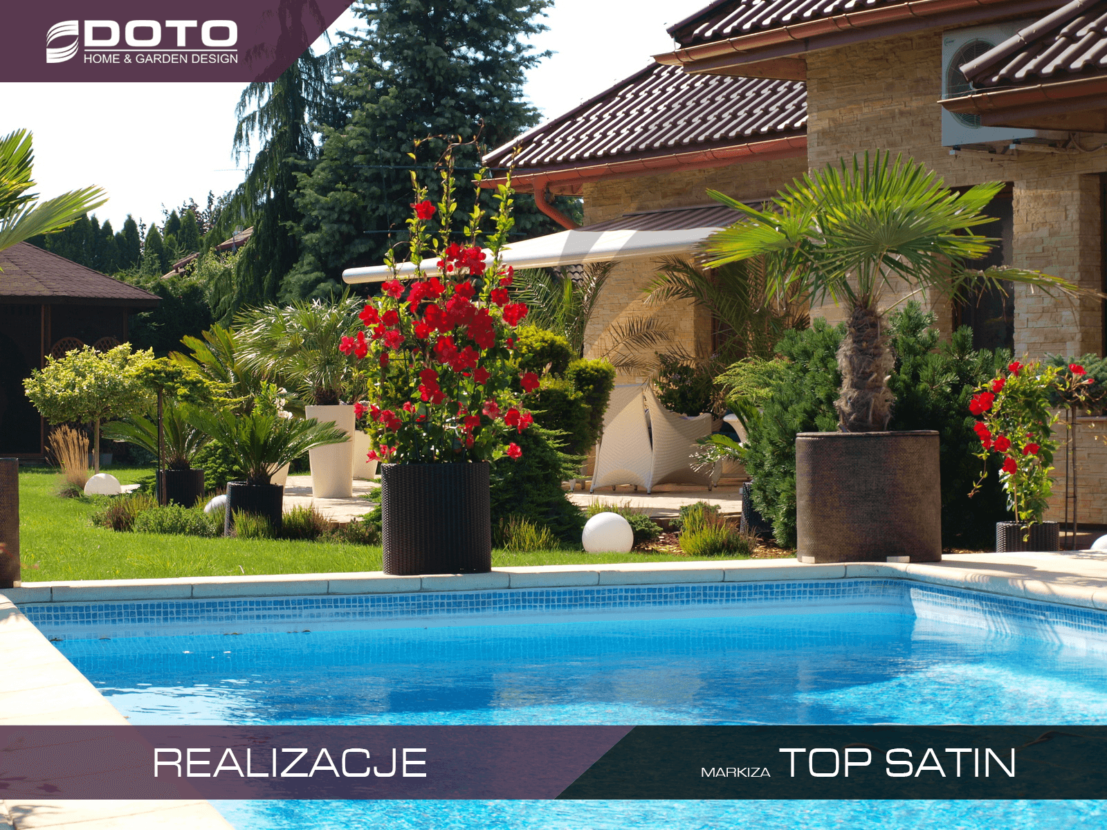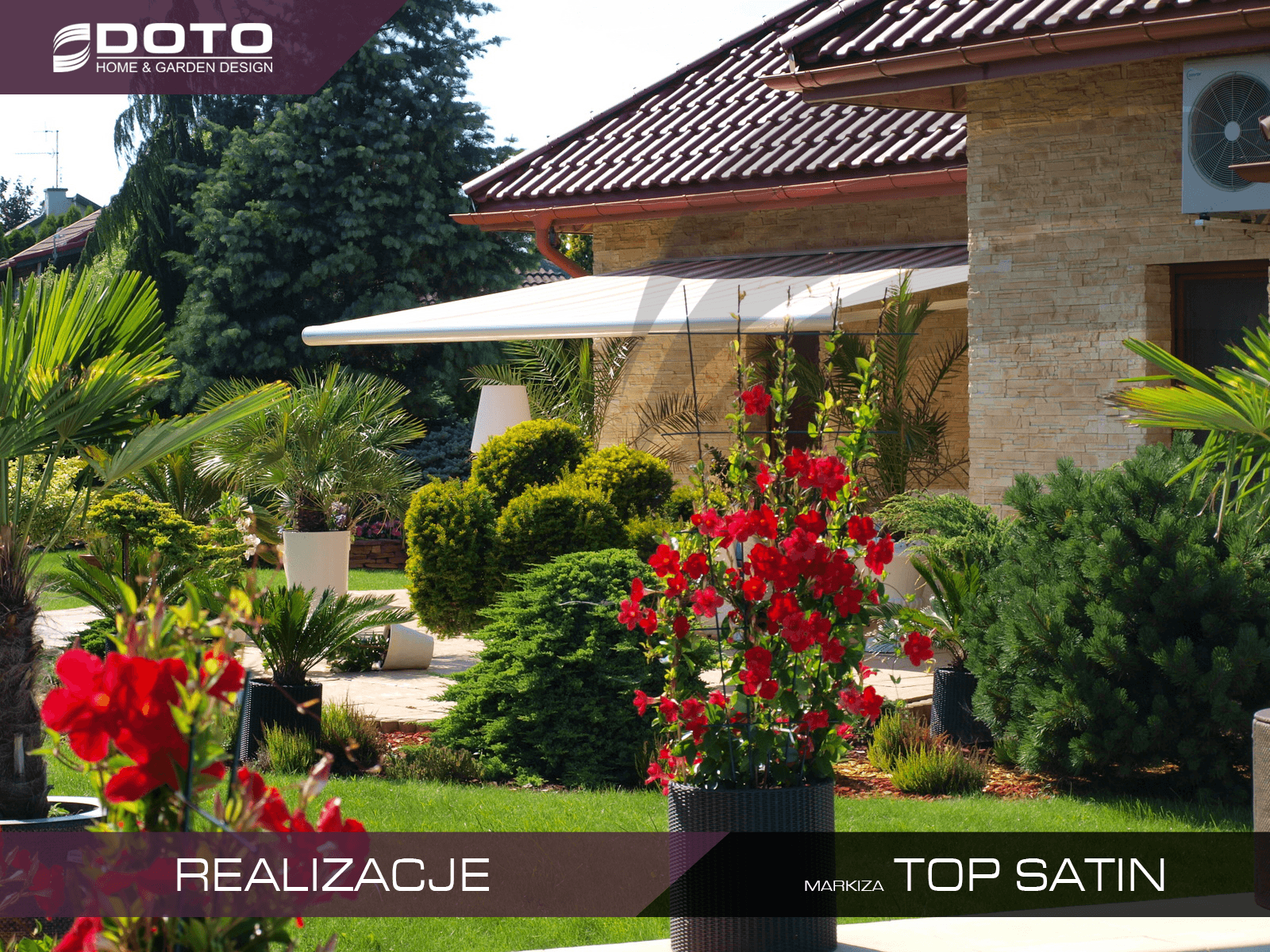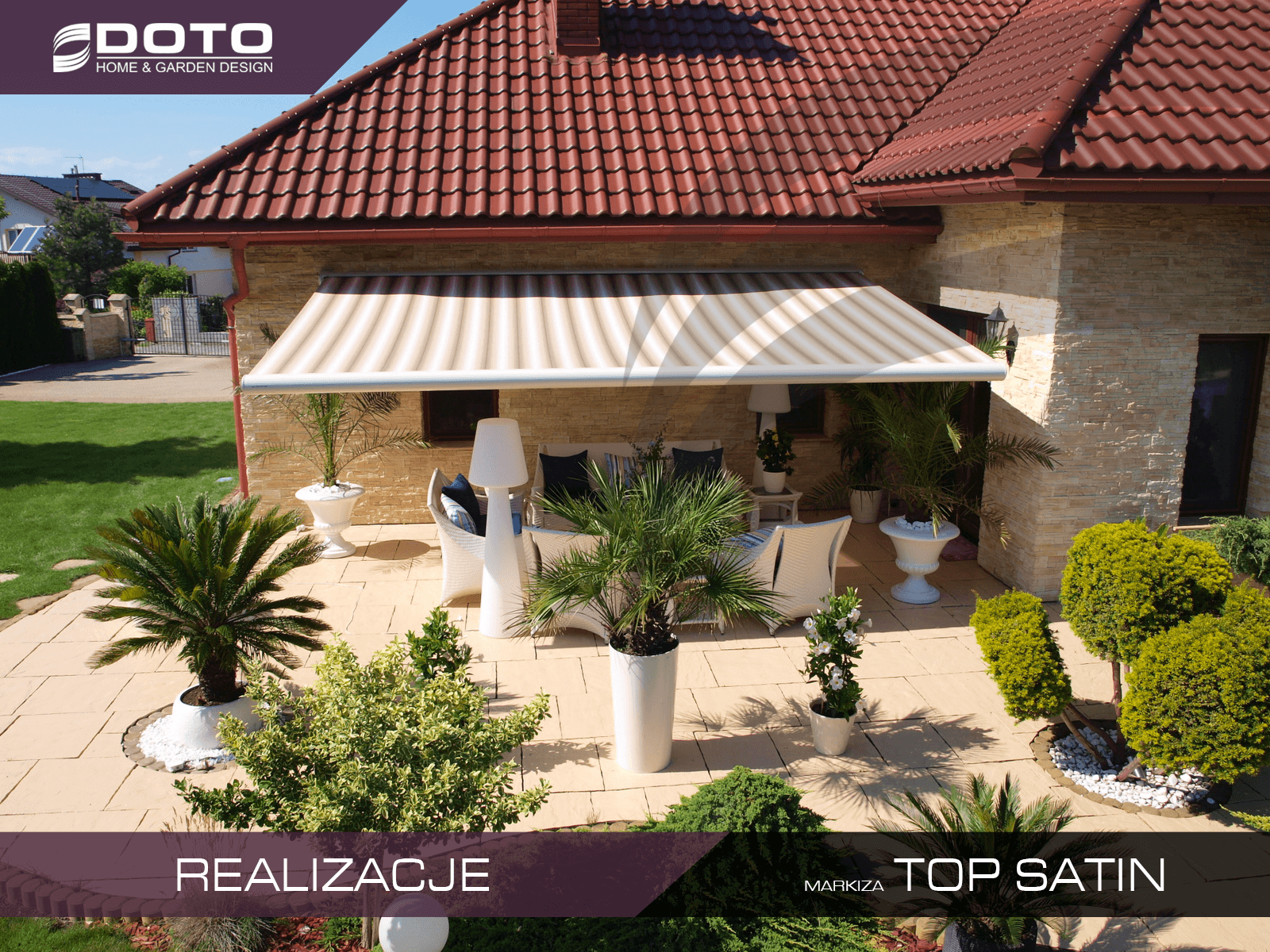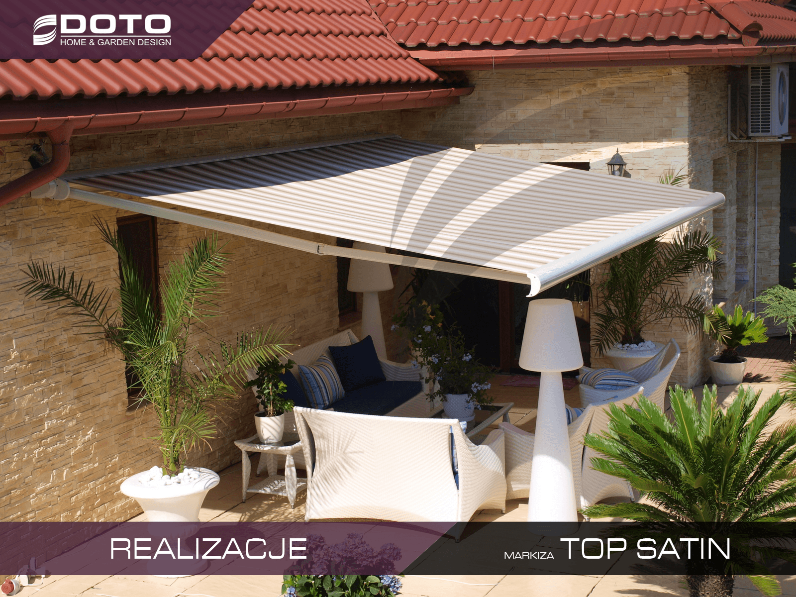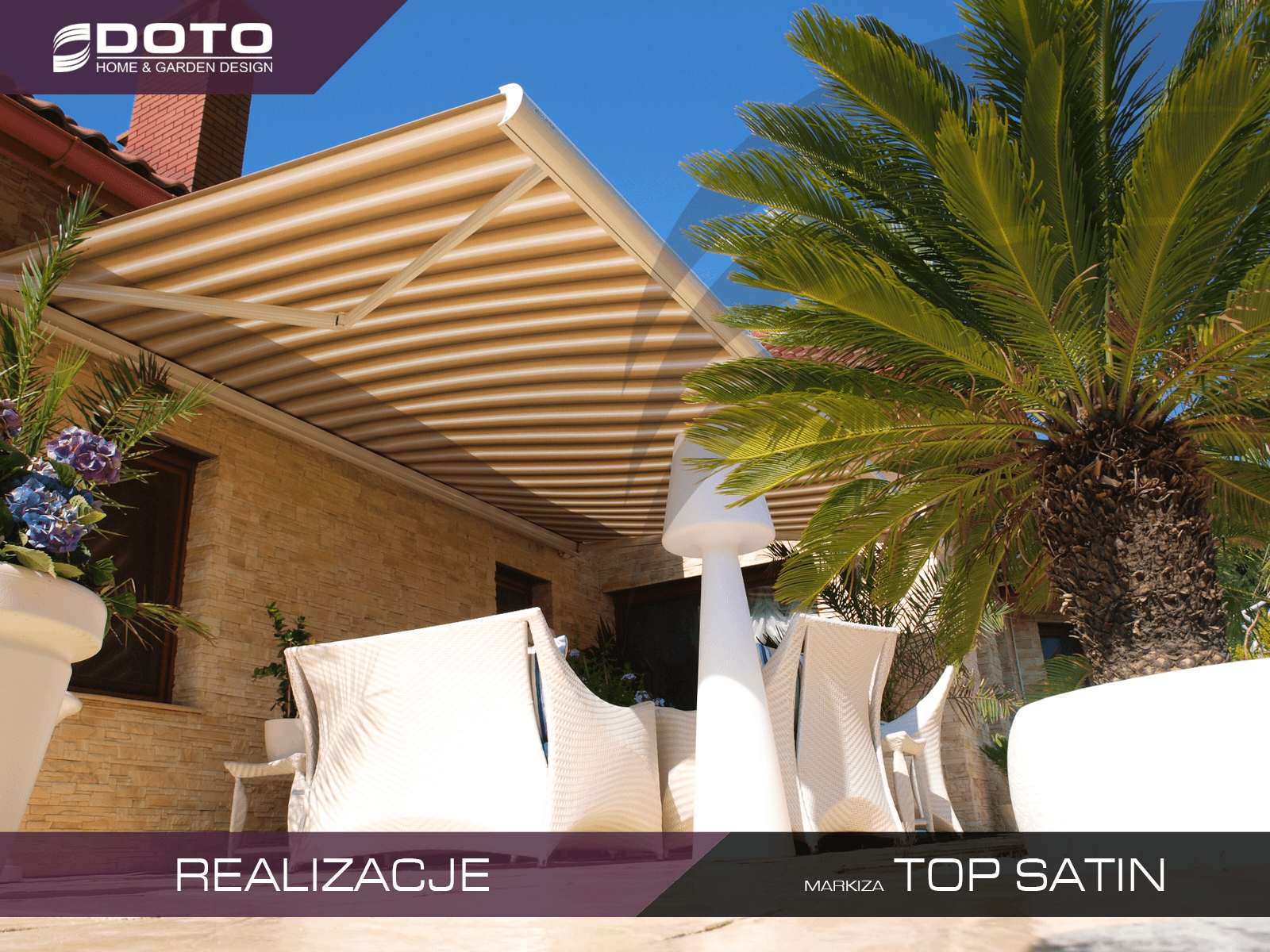 W przypadku tej realizacji wyzwaniem była nierówna powierzchnia ściany nieco utrudniająca montaż osłony. Mimo to prace przebiegły sprawnie i szybko. W efekcie powstała markiza doskonale wpisująca się w stylistykę budynku i otoczenia.TOP Satin to jedna z najpopularniejszych markiz Grupy TOP. Udoskonaliliśmy ją dzięki zastosowaniu innowacyjnej tkaniny Lumera składającej się z włókien Clean Brillant Akrylic. To właśnie CBA sprawiają, że powłoka tkaniny jest gładka i wybitnie wytrzymała, a jej kolory bardziej intensywne. Nad „tropikalnym” tarasem zawisła markiza w pełnej kasecie z napędem elektrycznym. Zwijaniem i rozwijaniem osłony steruje pilot. Dodatkowo wyposażyliśmy markizę w sensor pogodowy.Czujnik to niezwykle wygodne rozwiązanie. Dzięki niemu Właściciele przed każdym wyjazdem z domu czy nocnym odpoczynkiem nie muszą pamiętać o zwinięciu markizy, jeśli nagle pojawi się silny wiatr, osłona zostanie automatycznie złożona.