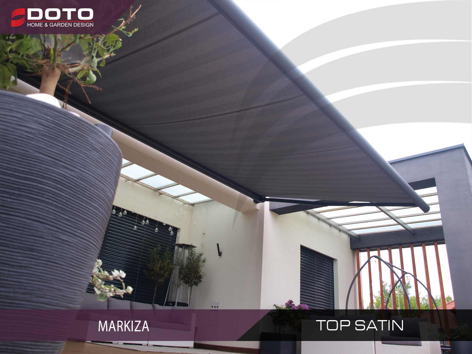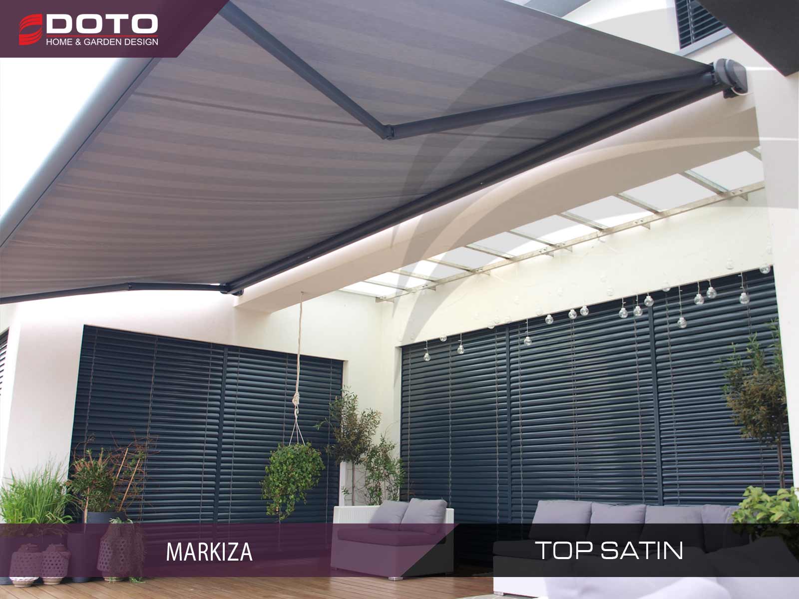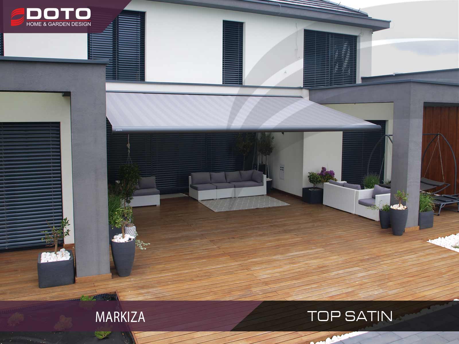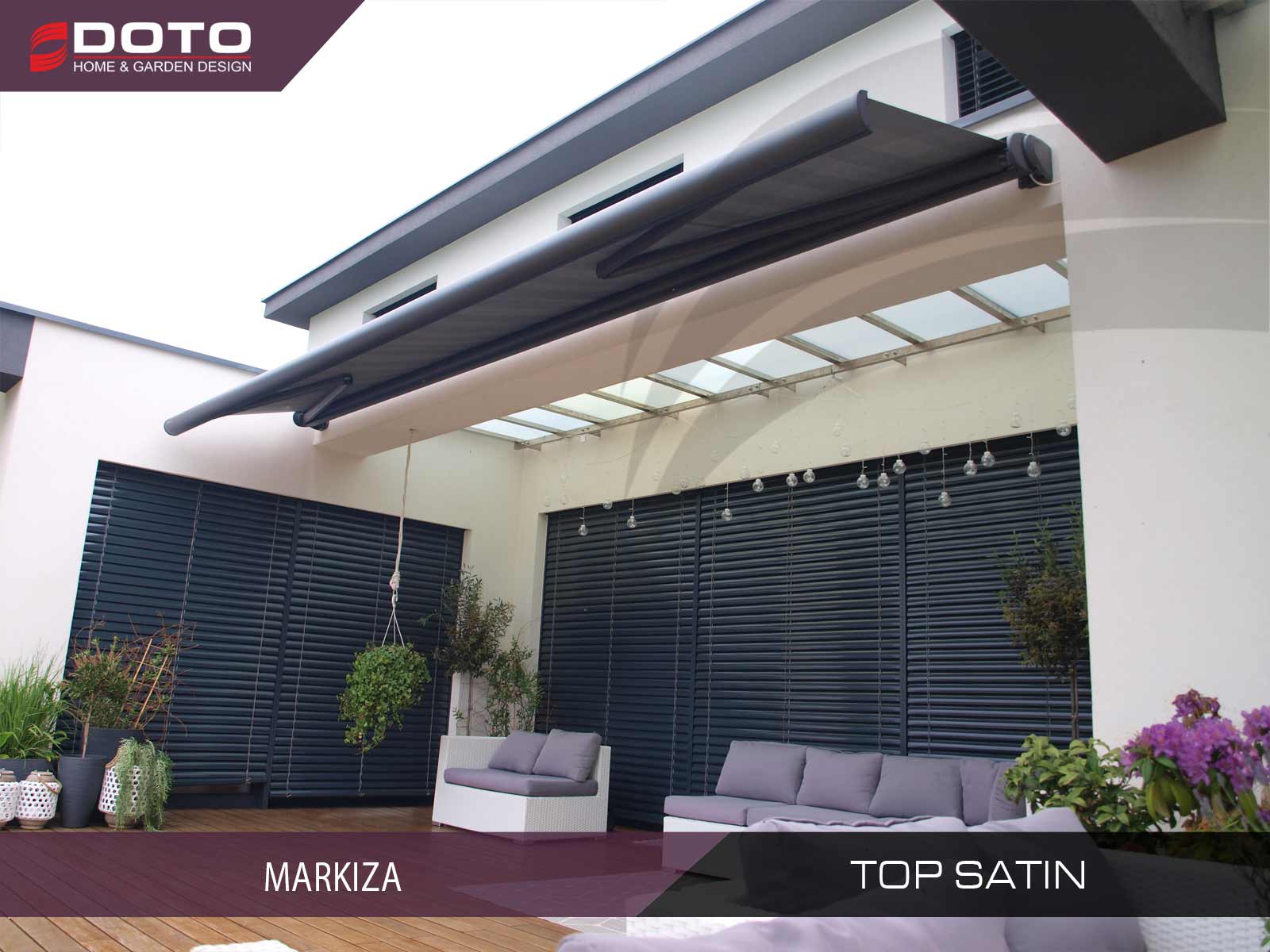 Teraz wybór padł na markizę tarasową – Top Satin. Jest to flagowy model grupy TOP. Początkowo rozważaliśmy montaż pergoli tarasowej, jednak Klientowi zależało na rozwiązaniu możliwie niewidocznym po złożeniu. Zdecydowanie nie chciał on żadnych dodatkowych słupów czy innych elementów konstrukcyjnych, które są nieuniknione przy pergoli tarasowej. Jako poszycie markizy zastosowaliśmy tkaninę akrylową, dzięki której możliwe jest korzystanie z tarasu podczas lekkiego deszczu.