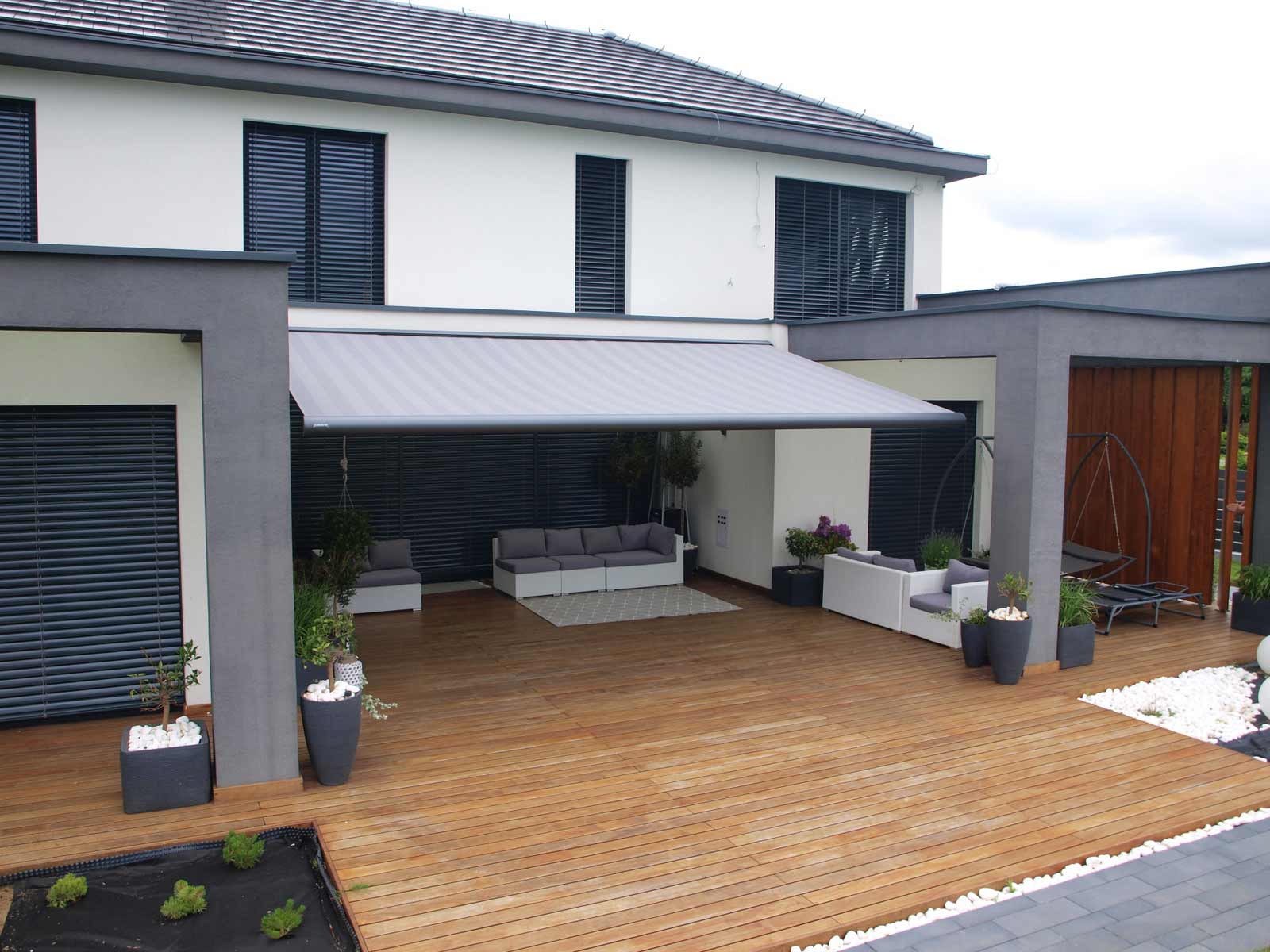 Opowiadając o tej realizacji, warto uwzględnić jeszcze jeden aspekt, mianowicie samo położenie nieruchomości. Dom zlokalizowany jest na wzgórzu, przez co częstym nieproszonym gościem na tarasie są silne wiatry. Markiza Top Satin stawi czoło wiatrom nawet z prędkościami dochodzącymi nawet do 38 km/h. Dodatkowo, aby zadbać o bezpieczeństwo użytkowników, wyposażyliśmy markizę w czujnik wiatrowy, dzięki czemu podczas silnego wiatru markiza złoży się automatycznie. Napędza ją niezawodny elektryczny napęd marki Somfy sterowany za pomocą pilota.