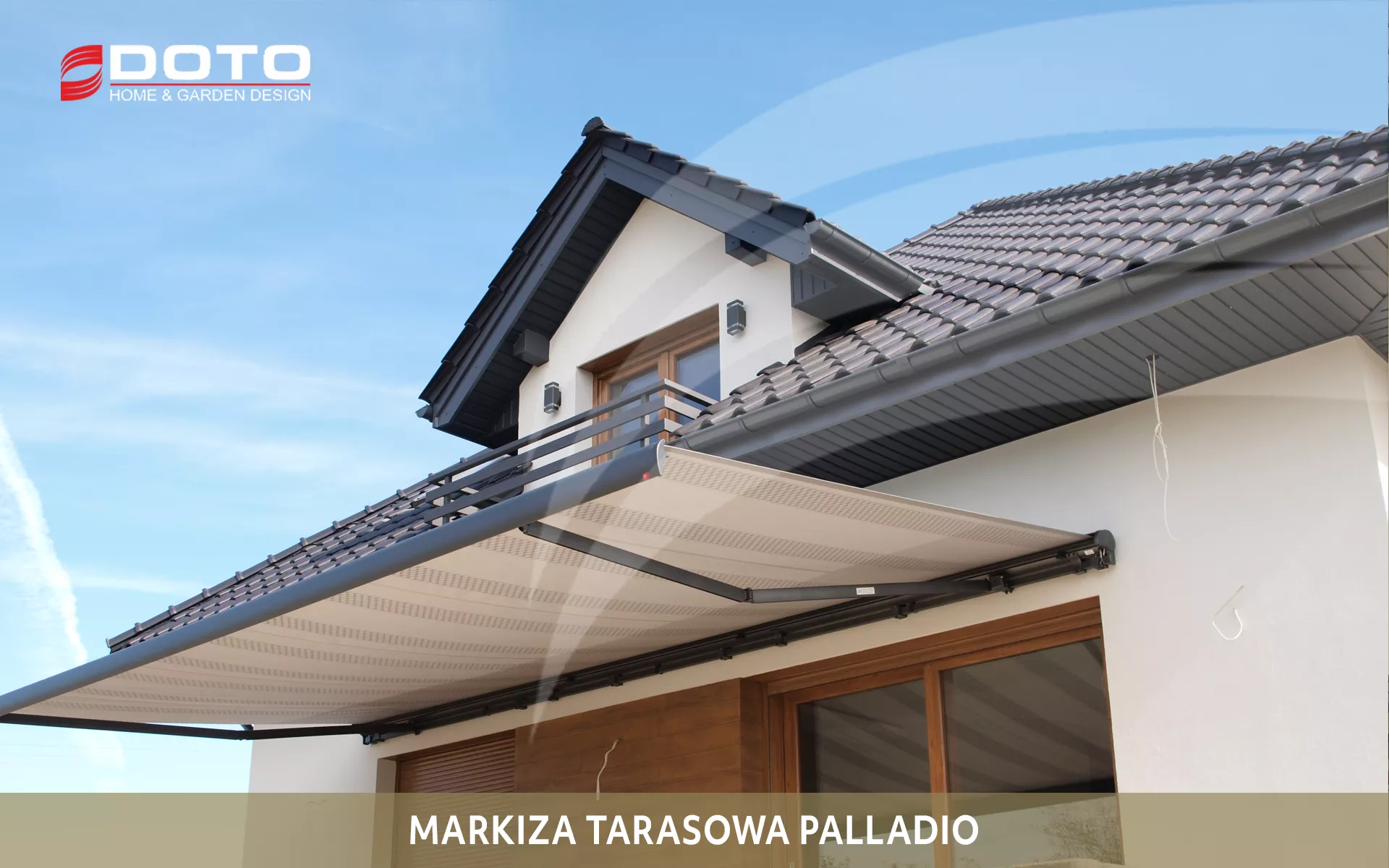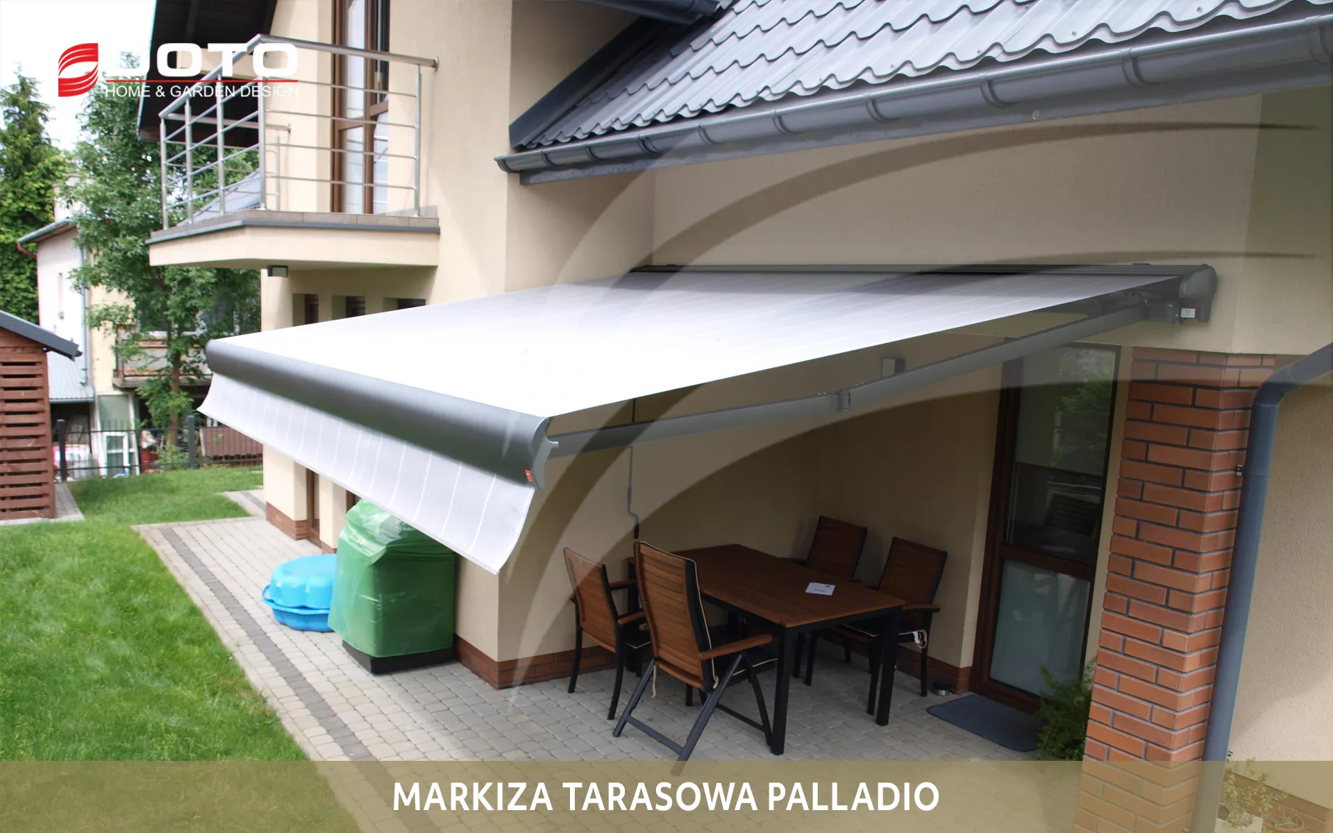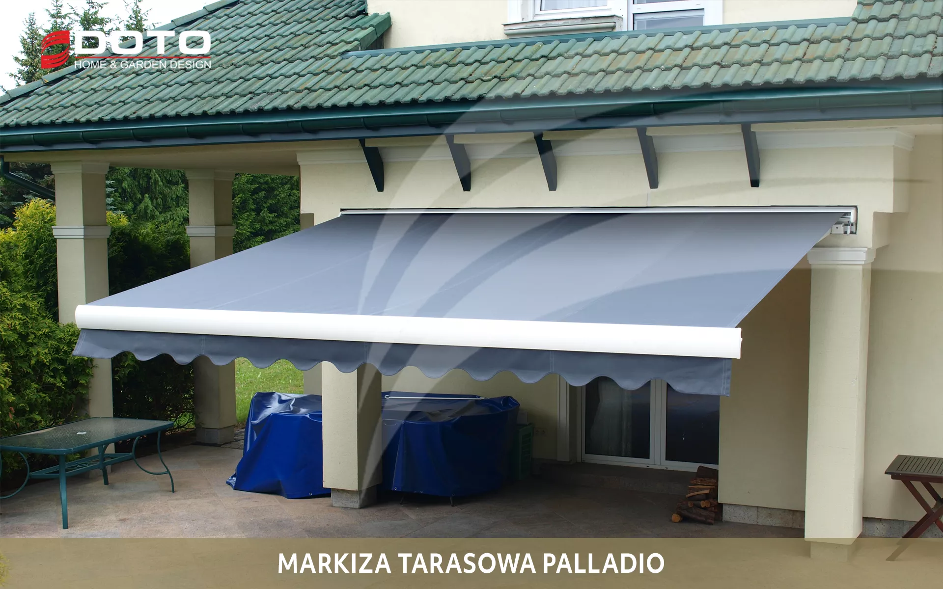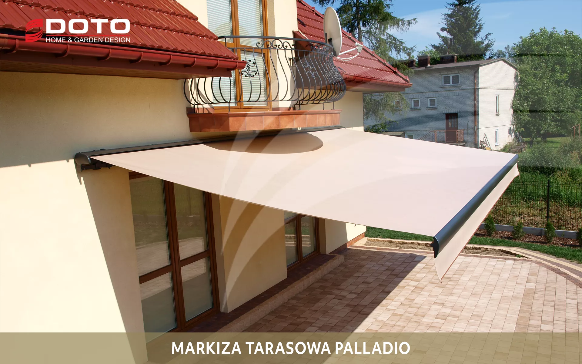 Markiza Palladio jest łatwa w montażu i może być zamocowana zarówno na ścianie, jak i na suficie lub krokwi dachowej. W ofercie dostępne są opcje podpór teleskopowych, których długości można dopasować do indywidualnych potrzeb, a także opcje dodatkowego wykończenia, takie jak falbana czy podświetlenie LED.