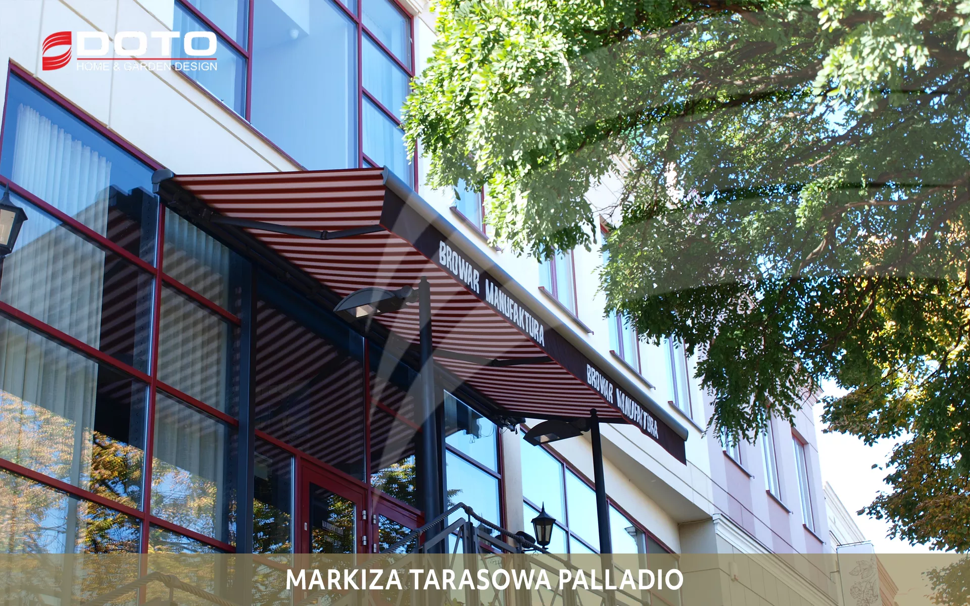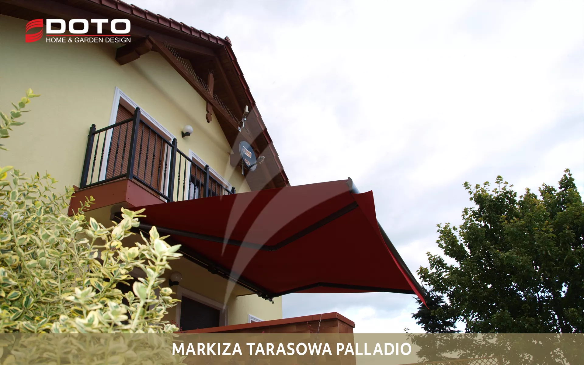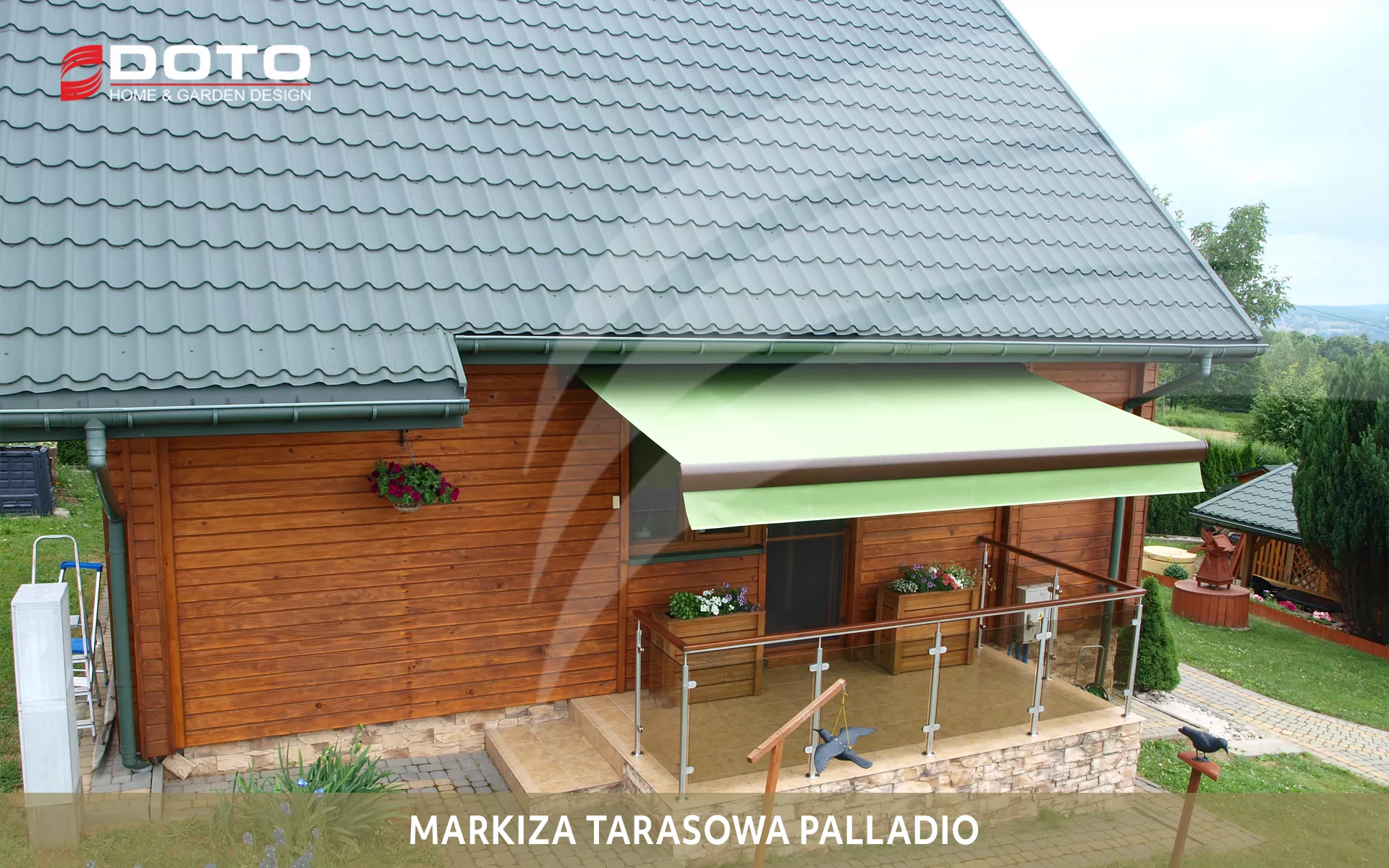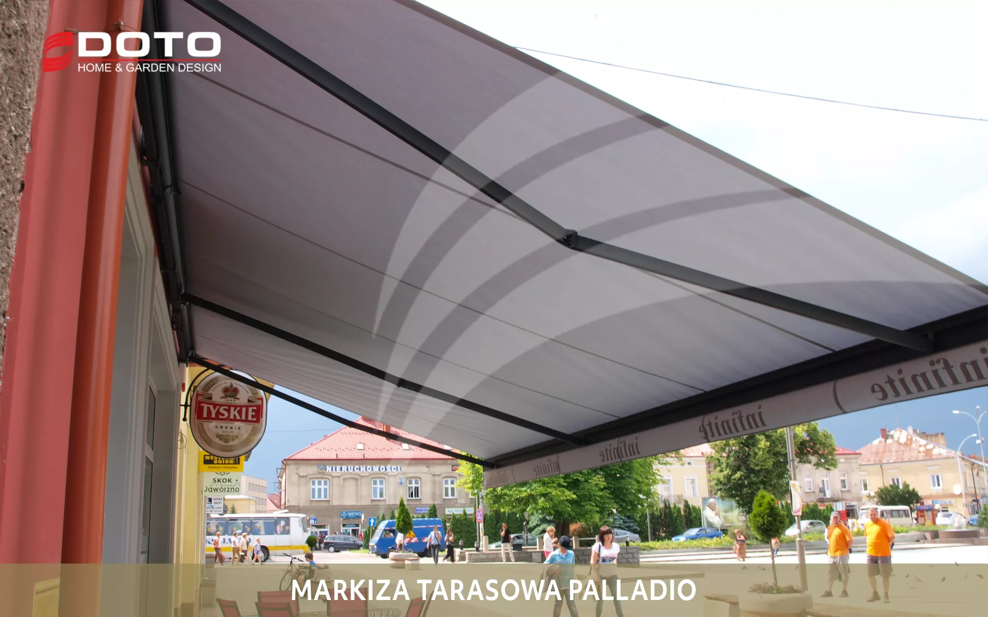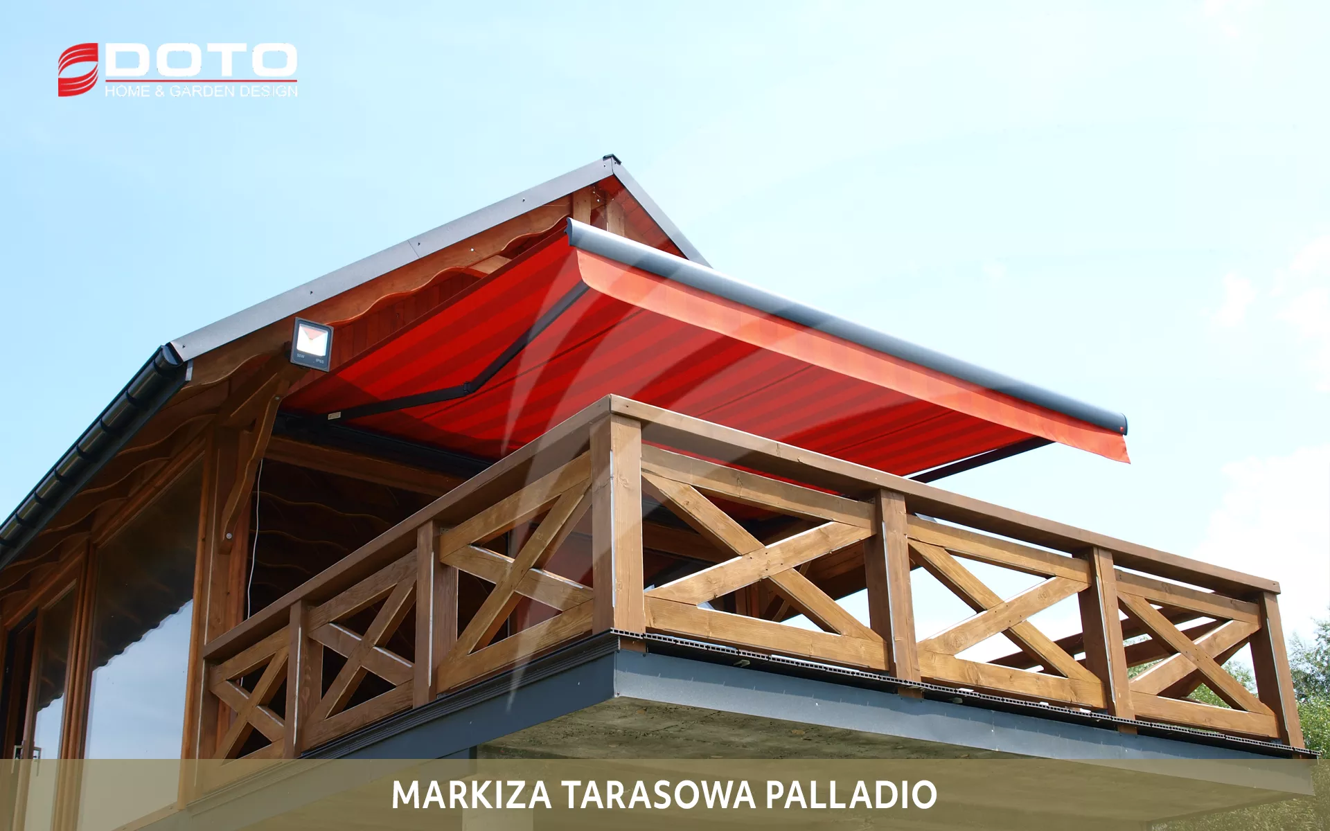 Markiza Palladio jest łatwa w montażu i może być zamocowana zarówno na ścianie, jak i na suficie lub krokwi dachowej. W ofercie dostępne są opcje podpór teleskopowych, których długości można dopasować do indywidualnych potrzeb, a także opcje dodatkowego wykończenia, takie jak falbana czy podświetlenie LED.