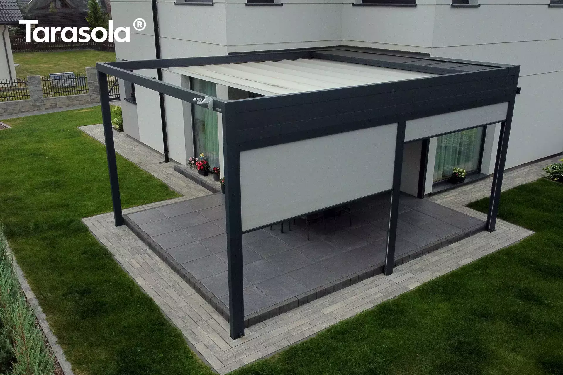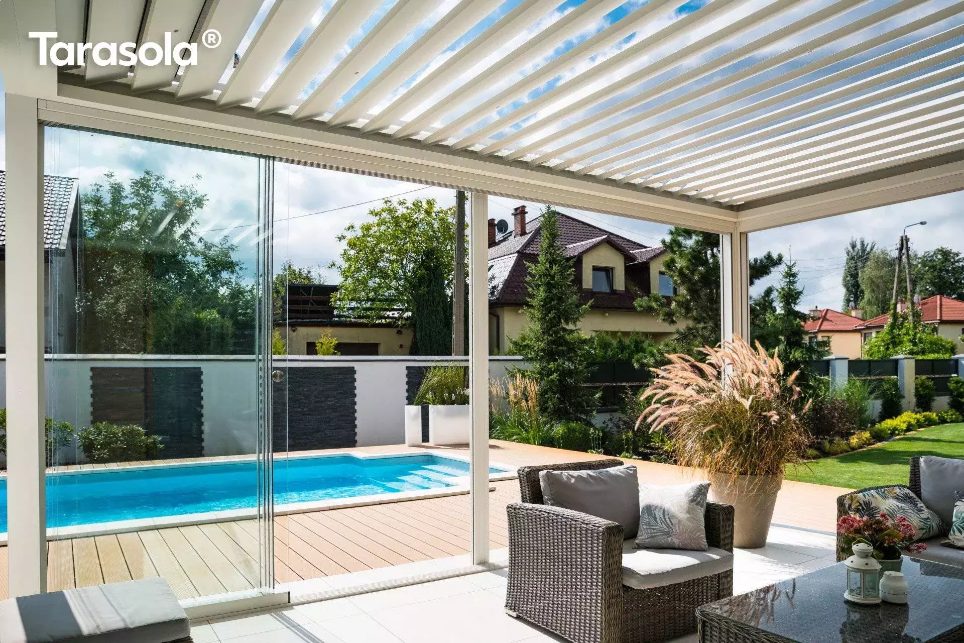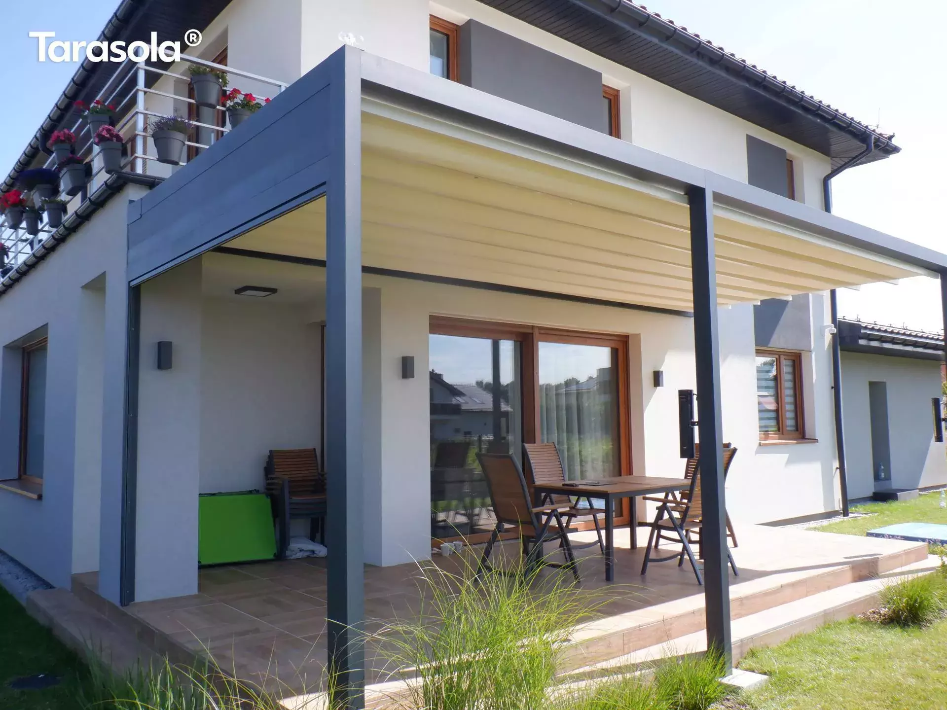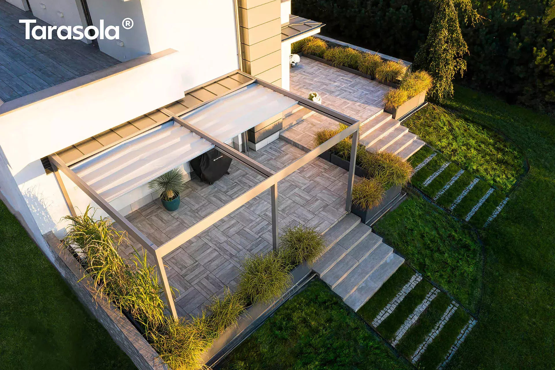 Istnieje także nowoczesna opcja pergoli lamelowej z całkowicie zsuwanym dachem, który pozwala w pełni otworzyć przestrzeń i korzystać z otwartego nieba, kiedy tylko masz na to ochotę.