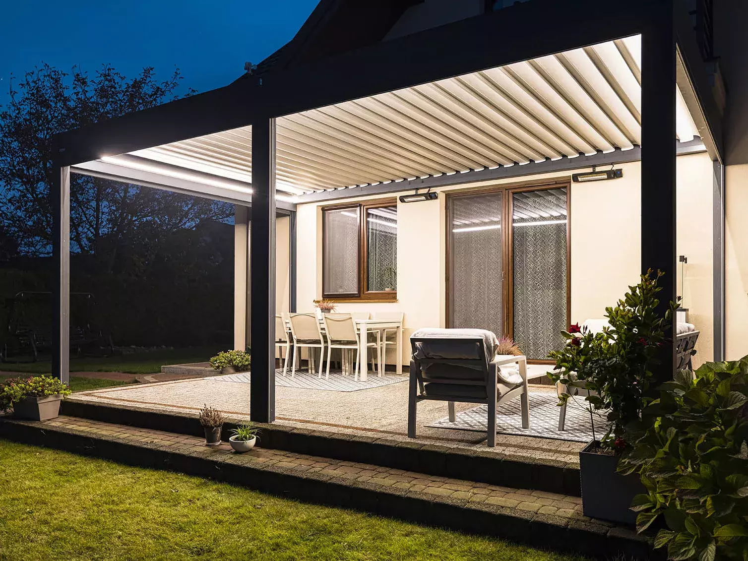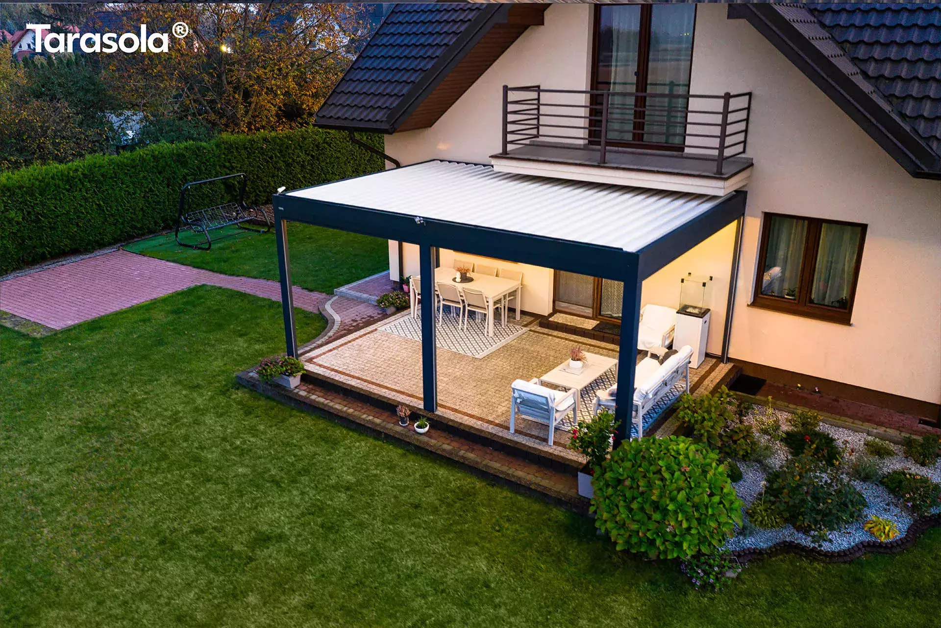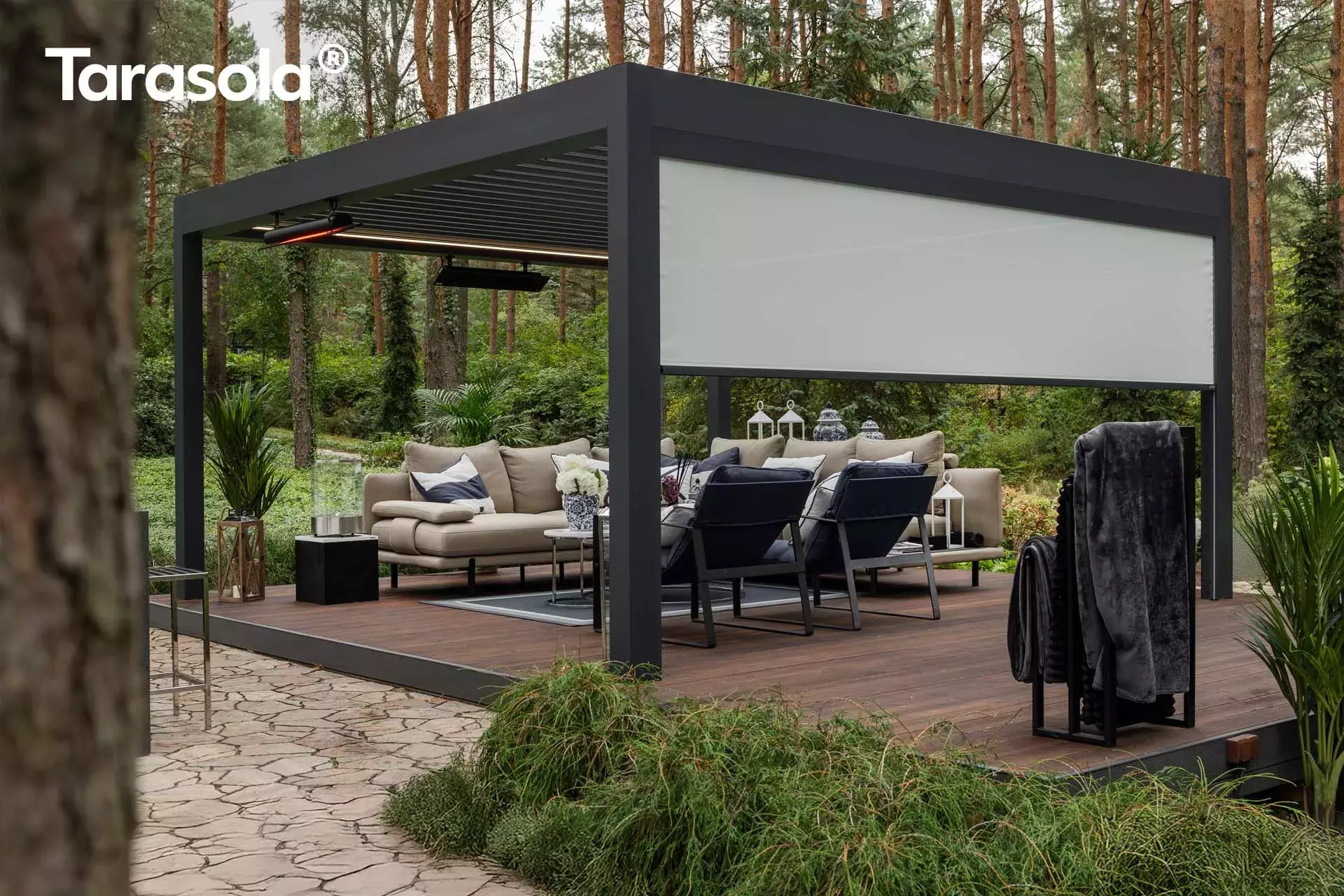 Istnieje także nowoczesna opcja pergoli lamelowej z całkowicie zsuwanym dachem, który pozwala w pełni otworzyć przestrzeń i korzystać z otwartego nieba, kiedy tylko masz na to ochotę.