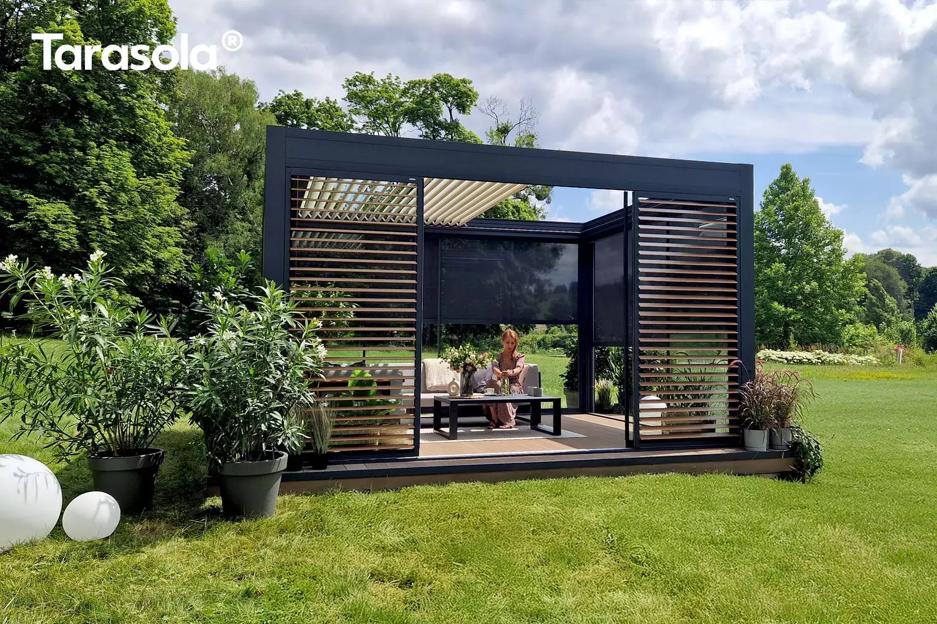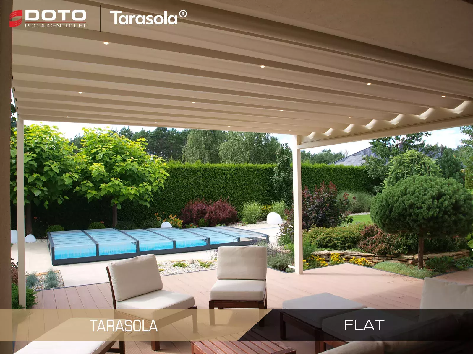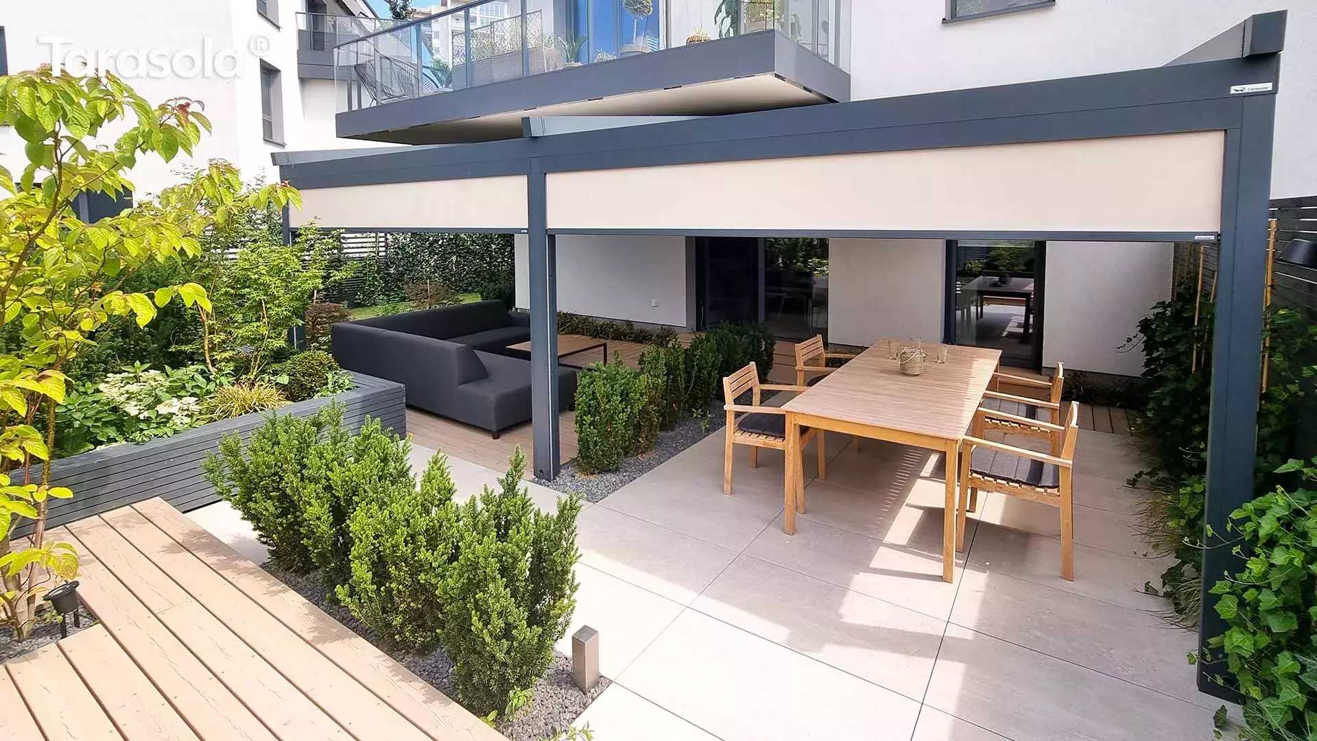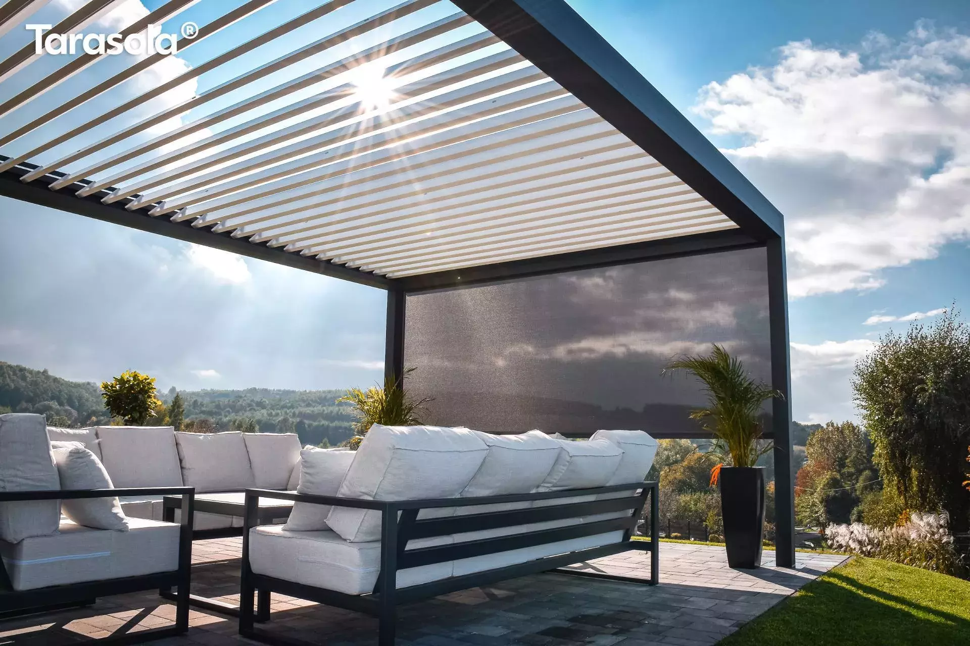 Dach pergoli rozsuwa się na prowadnicach, podobnie jak w markizie, zapewniając cień wtedy, gdy jest najbardziej potrzebny.