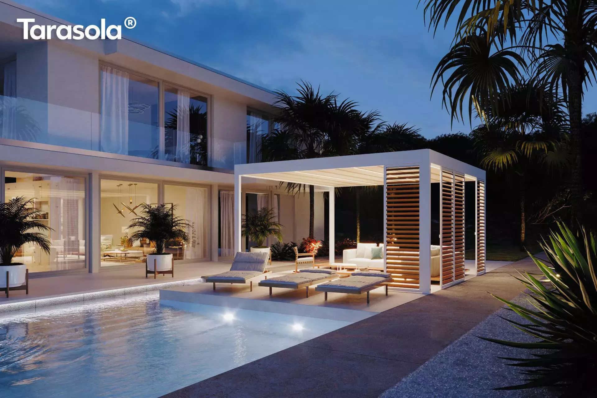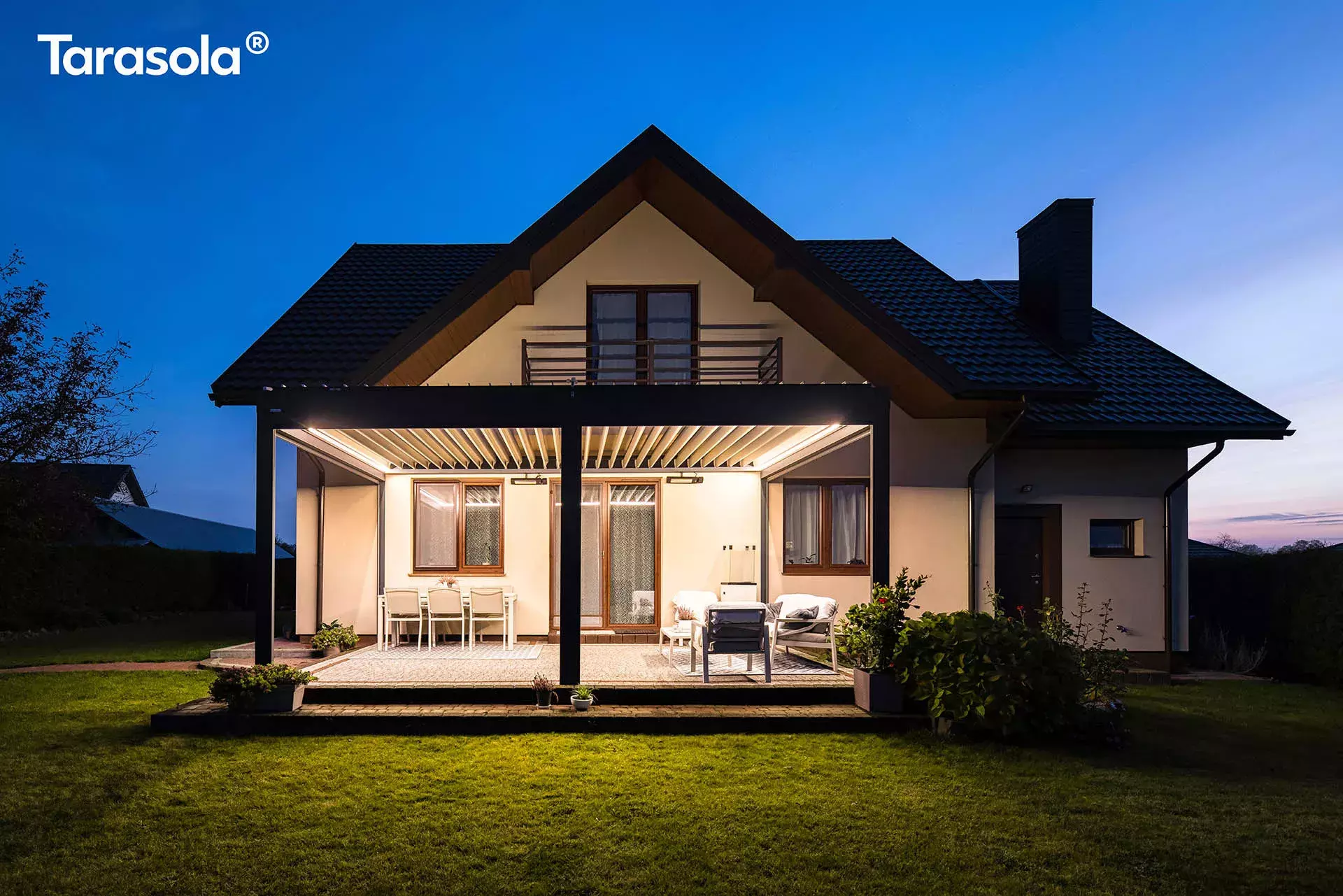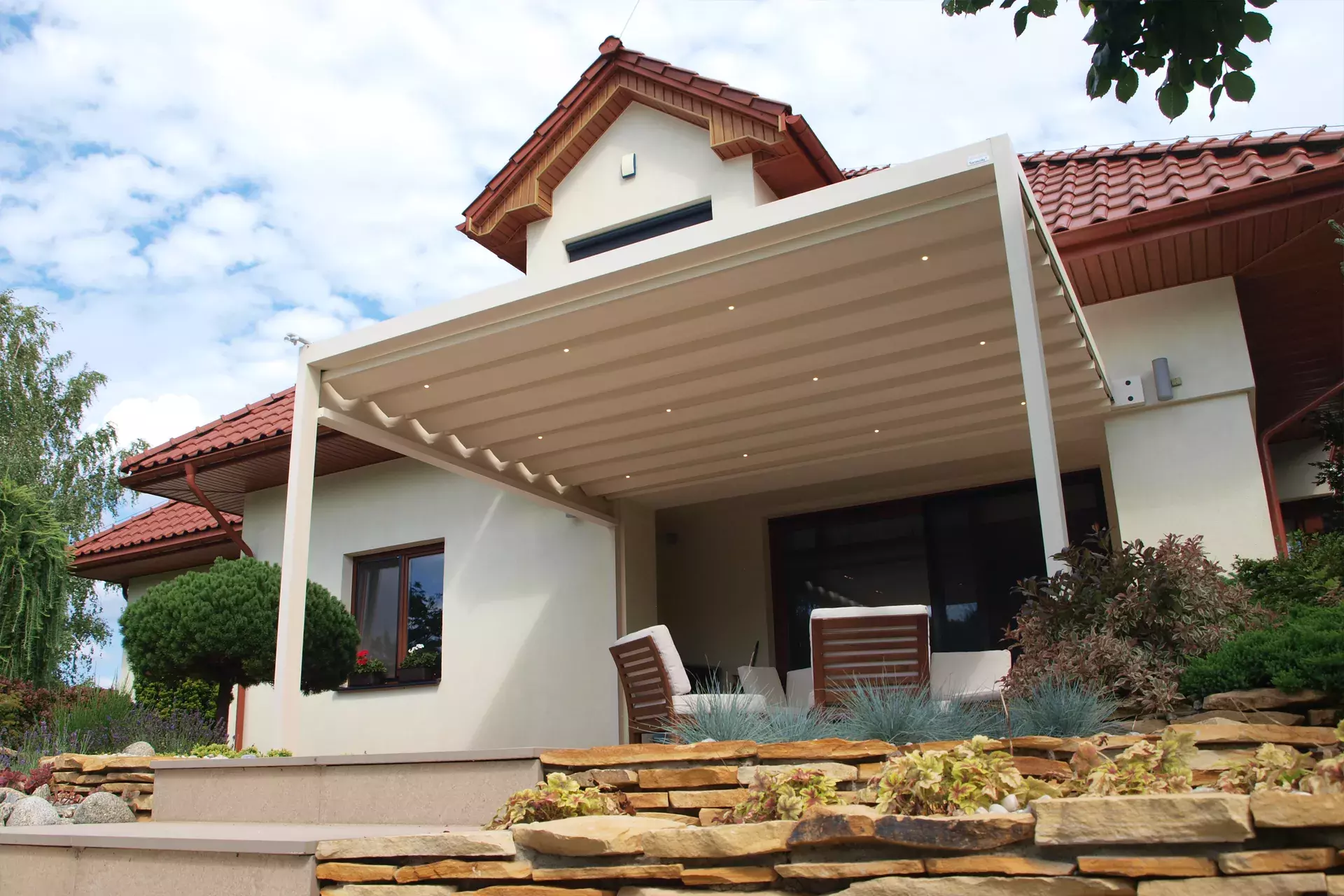 Pergola lamelowa z ruchomymi lub zsuwanymi aluminiowymi lamelami daje pełną kontrolę nad światłem i zacienieniem. Wystarczy ustawić odpowiedni kąt, by cieszyć się promieniami słońca lub całkowitym cieniem.