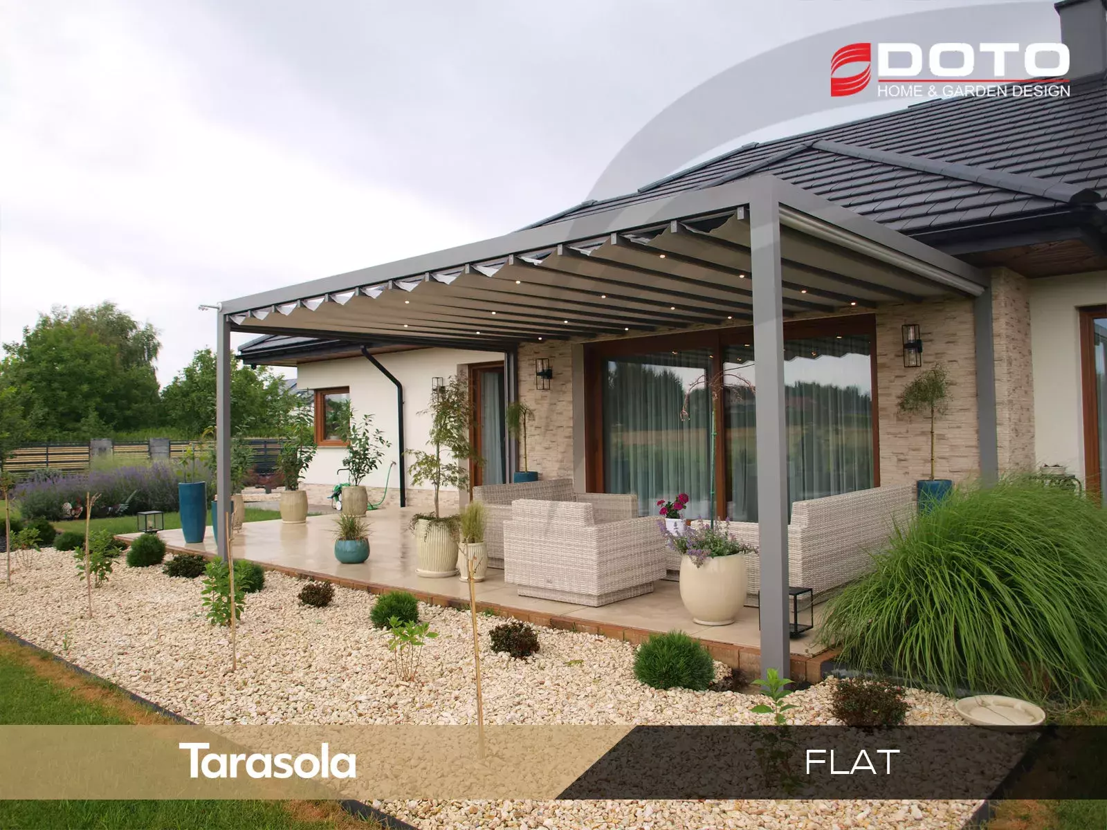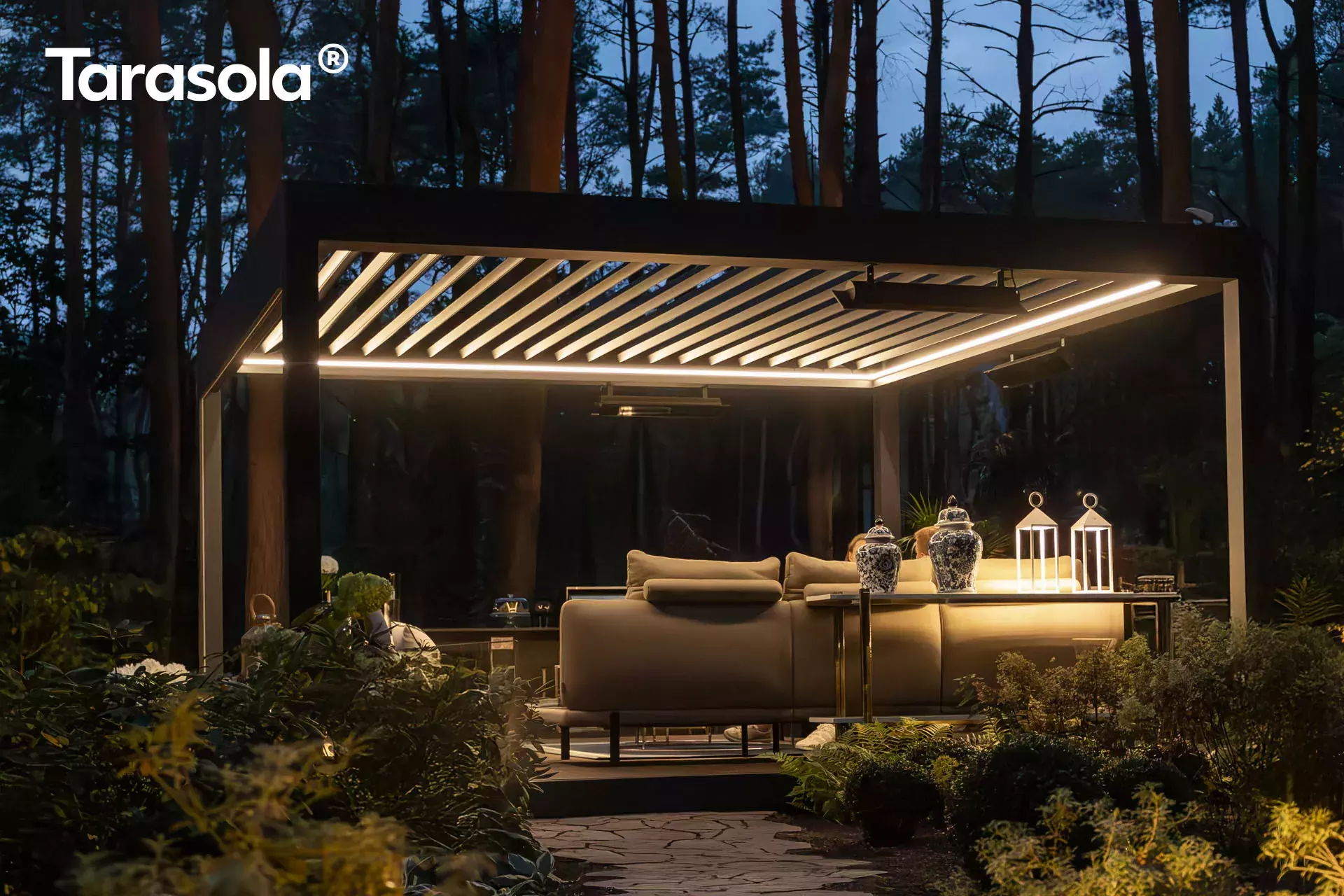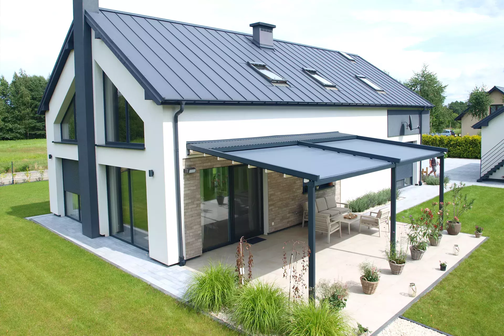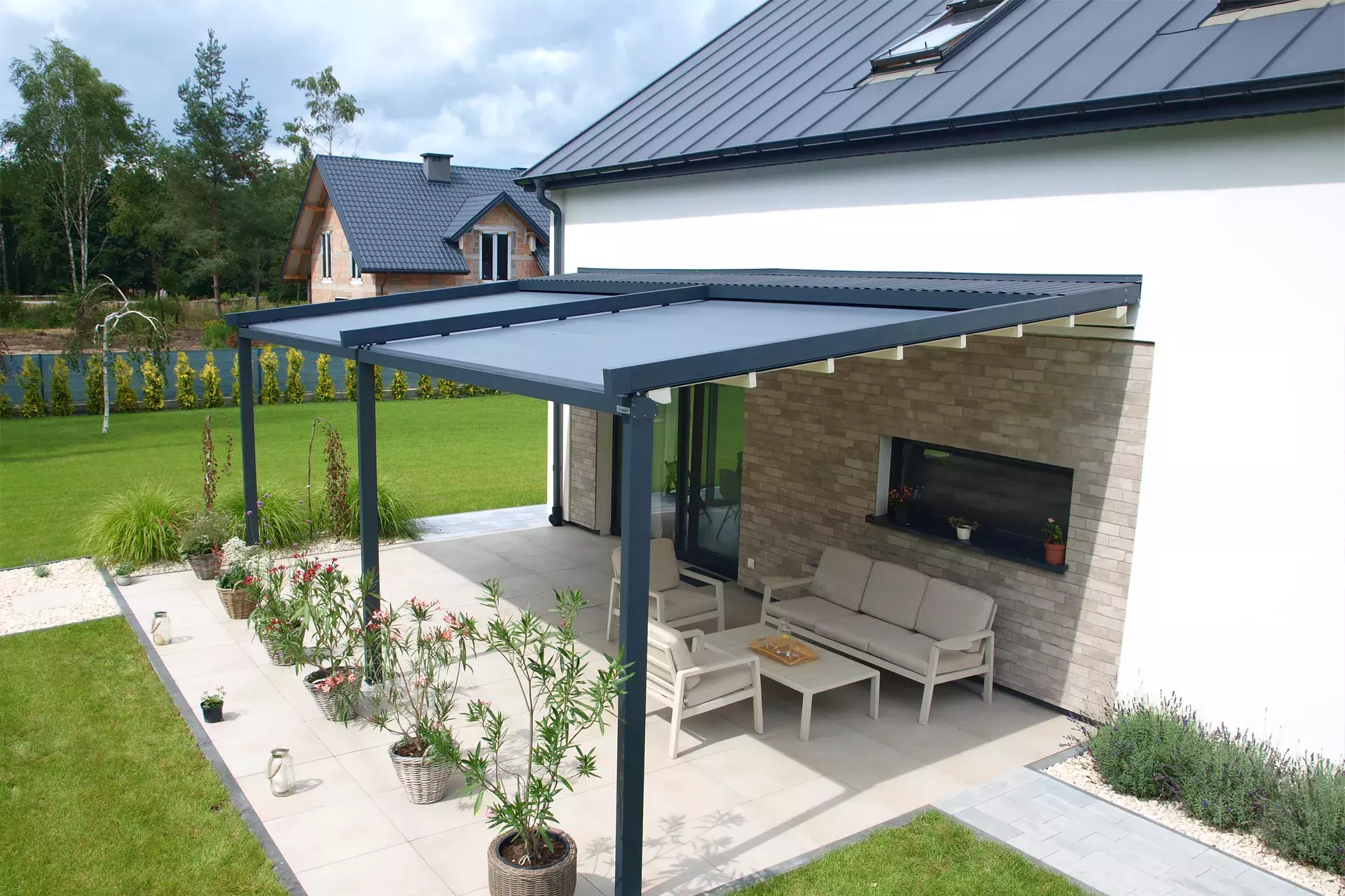 Pergola lamelowa z ruchomymi lub zsuwanymi aluminiowymi lamelami daje pełną kontrolę nad światłem i zacienieniem. Wystarczy ustawić odpowiedni kąt, by cieszyć się promieniami słońca lub całkowitym cieniem.