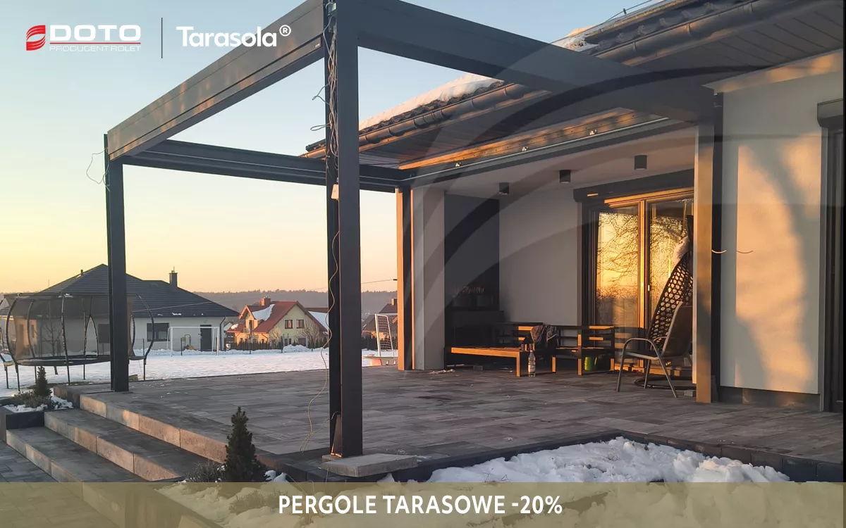Montaż pergoli zimą w zimowych warunkach to wyzwanie, ale w DOTO realizujemy go pewnie i bezpiecznie dzięki specjalistycznym materiałom oraz środkom ochrony. Dzięki temu taras Tarasola jest gotowy na wiosnę, a Ty oszczędzasz na promocji -20%!
