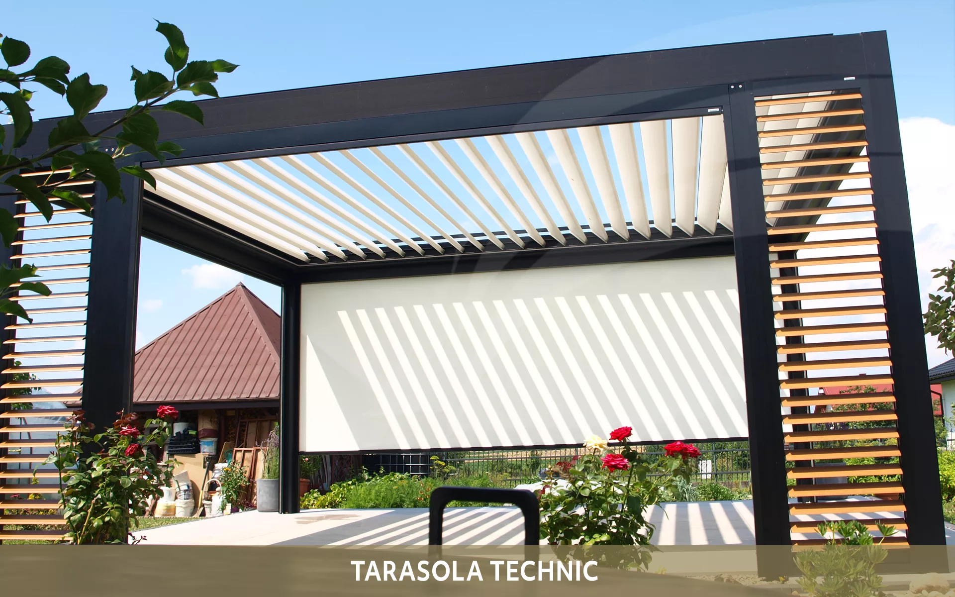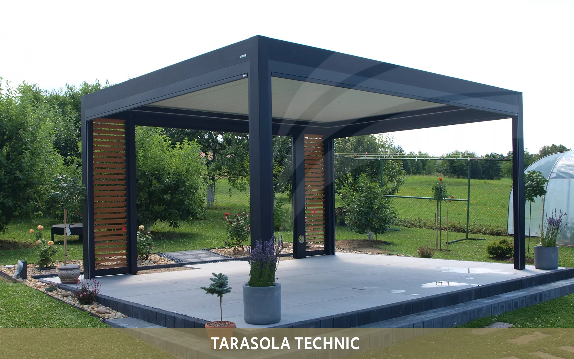 Dach Tarasoli TECHIC stanowią aluminiowe lamele o regulowanym kącie nachylenia od 0° do 135°. Lamele są lakierowane proszkowo, trwałe i odporne na warunki atmosferyczne. Ułożone poziomo chronią przed deszczem i słońcem, a po uchyleniu pozwalają na kontrolowane doświetlenie i wentylację przestrzeni pod pergolą. System dachowy umożliwia swobodne odprowadzanie wody, co pozwala na komfortowe korzystanie z pergoli przez cały rok niezależnie od pogody.