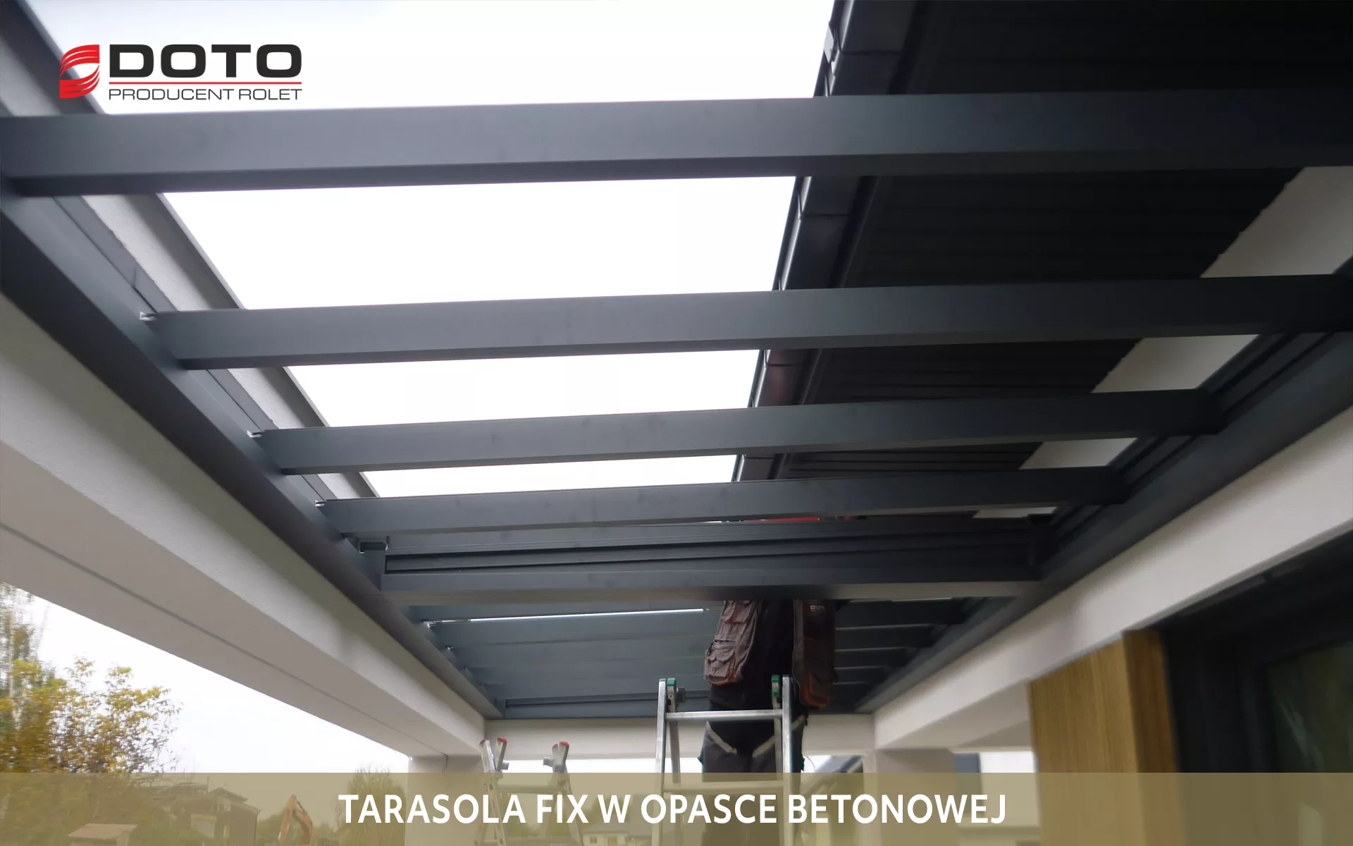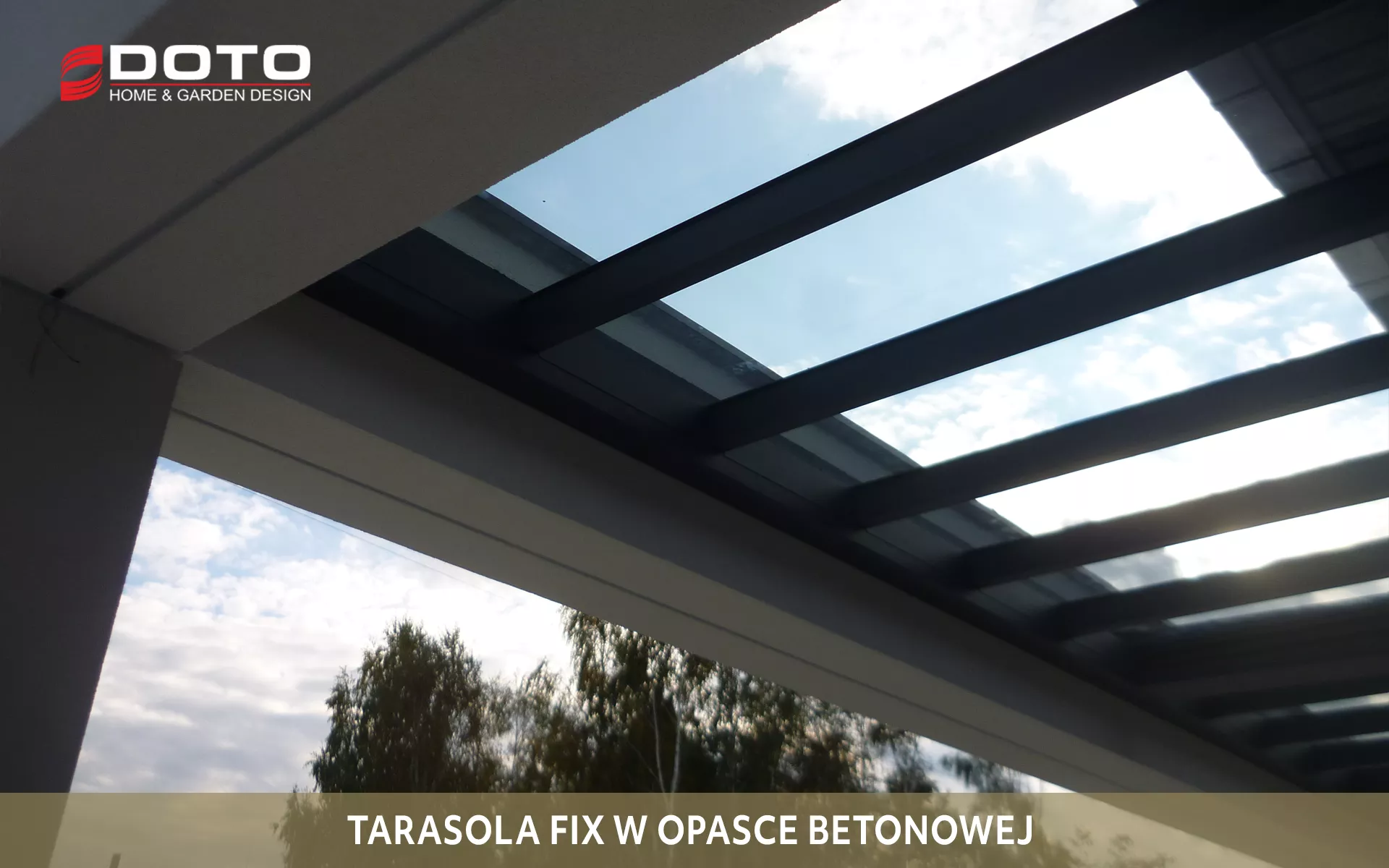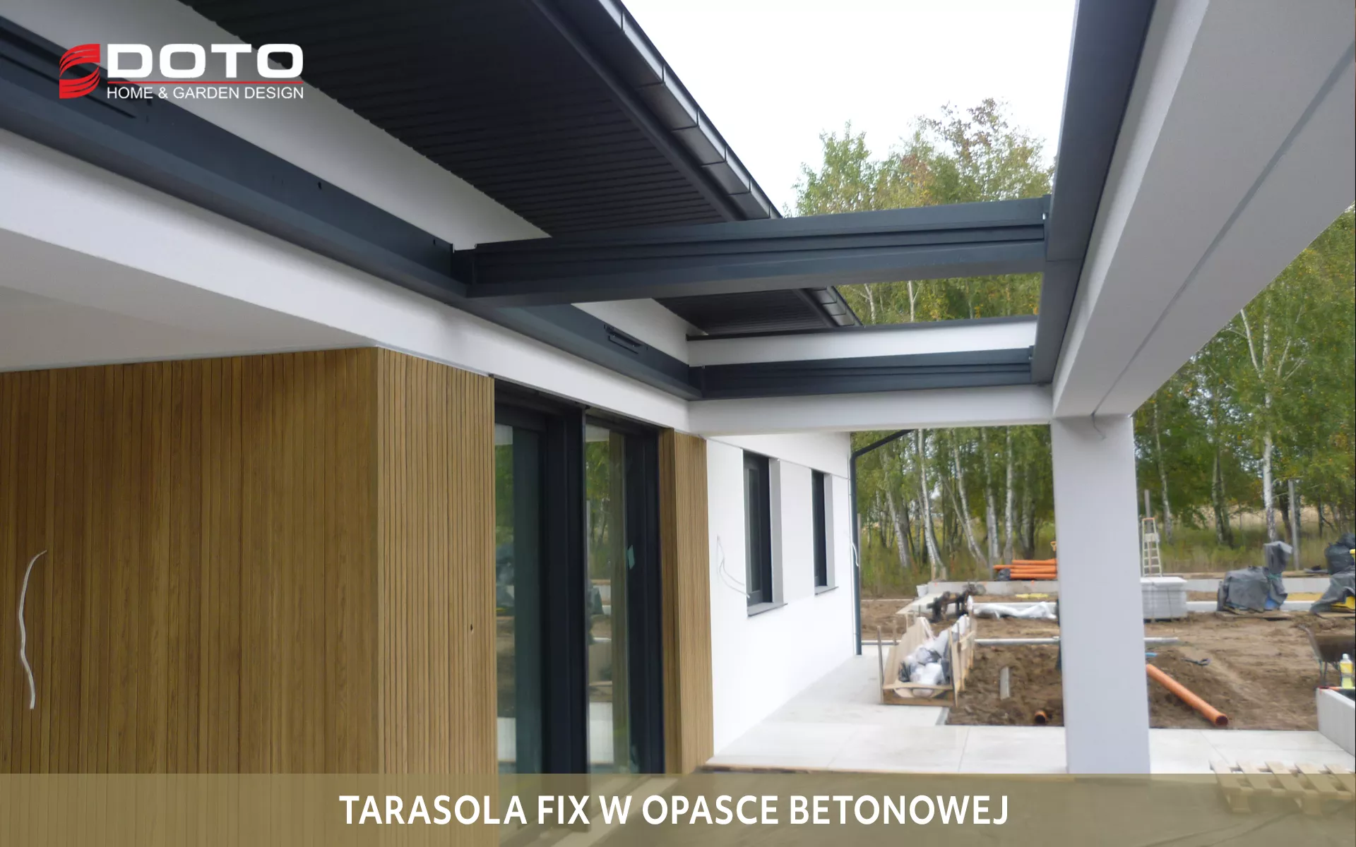 Tarasola Fix to stała konstrukcja aluminiowa z dachem z poliwęglanu komorowego lub szkła klejonego tzw. bezpiecznego, które gwarantuje wysoką wytrzymałość i ochronę. Zapewnia ochronę przed deszczem, wiatrem i promieniowaniem UV, jednocześnie wpuszczając dużo naturalnego światła. Jej poziomy układ doskonale współgra z opaską betonową, podkreślając nowoczesny, minimalistyczny styl domu i optycznie powiększając przestrzeń tarasu.